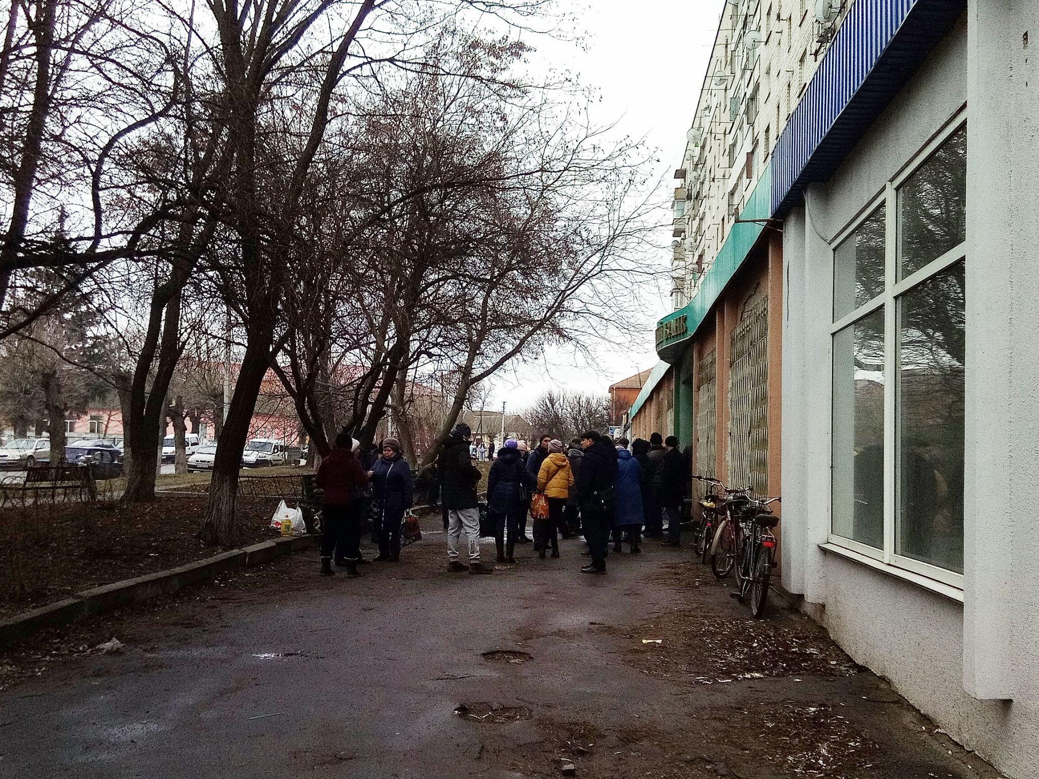 Четвер, 24 лютого. Біля банкомата “Ощадбанк” величезна черга. Ми ще ніколи не бачили такої кількості людей, навіть у дні, коли залізничники отримують зарплату.
