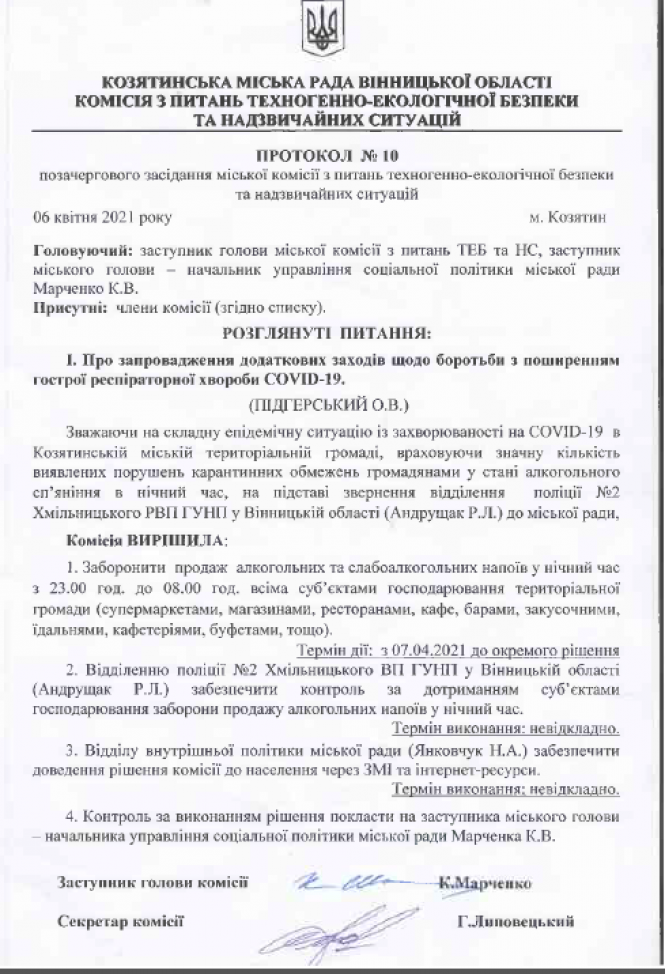 В результаті обговорення вирішили — заборонити з 7 квітня і до окремого рішення продаж алкогольних та слабоалкогольних напоїв у нічний час з 23.00 год. до 8.00 год. усіма суб’єктами господарювання територіальної громади (супермаркетами, магазинами, ресторанами, кафе, барами, закусочними, їдальнями, кафетеріями, буфетами, тощо).