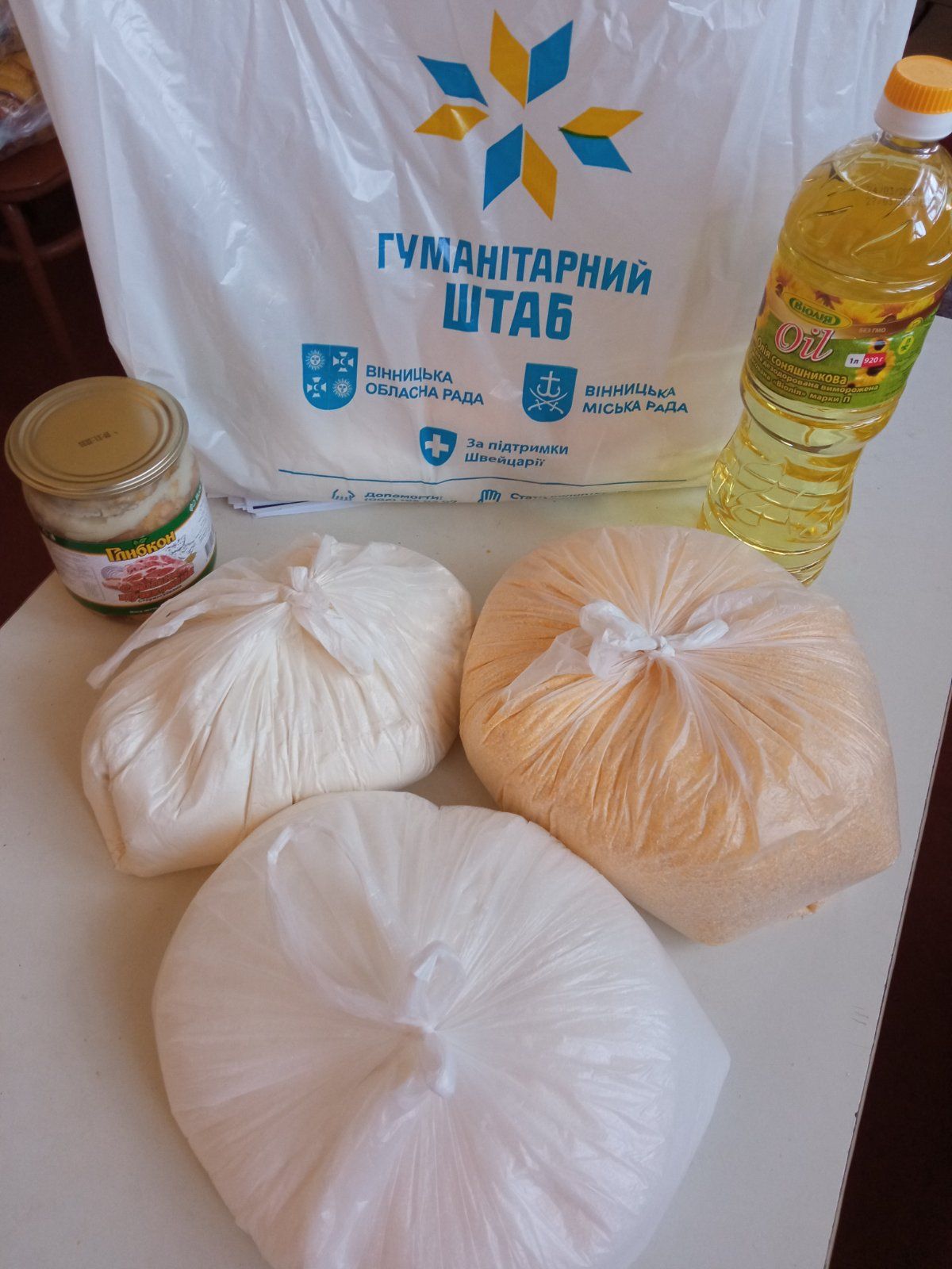 У пакетах – цукор, кукурудзяна крупа, борошно, олія, тушонка.
