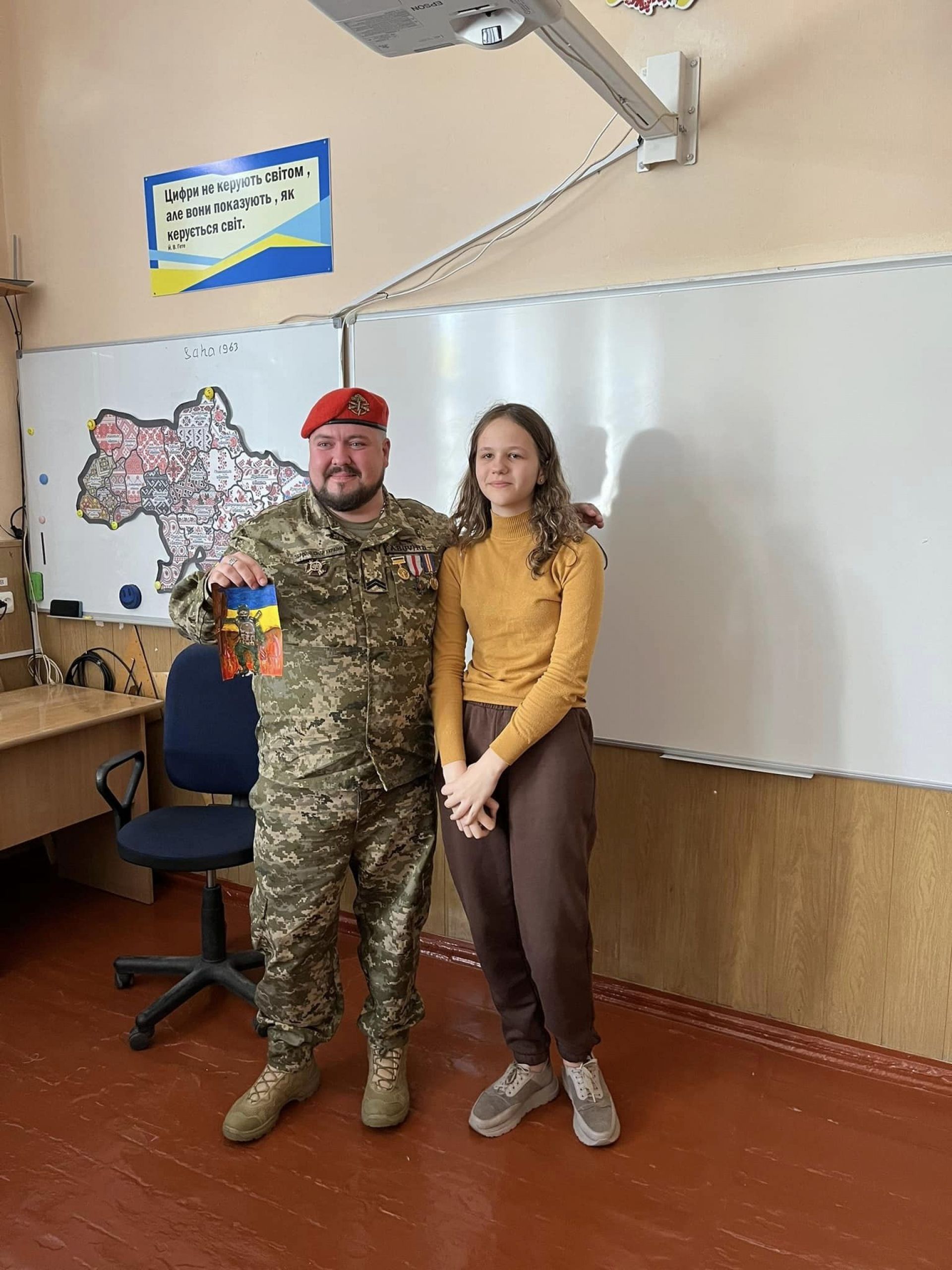 — Воїн поспілкувався з учнями 9-А класу та їх класним керівником Тимощук Г. М. і розповів про власний досвід, подробиці служби, емоційний стан, як вдається зберігати «холодний» розум та злагоджено працювати в команді. Учні були дуже раді особисто поспілкувався з військовим та висловити йому свою повагу та вдячність, — йдеться у повідомленні