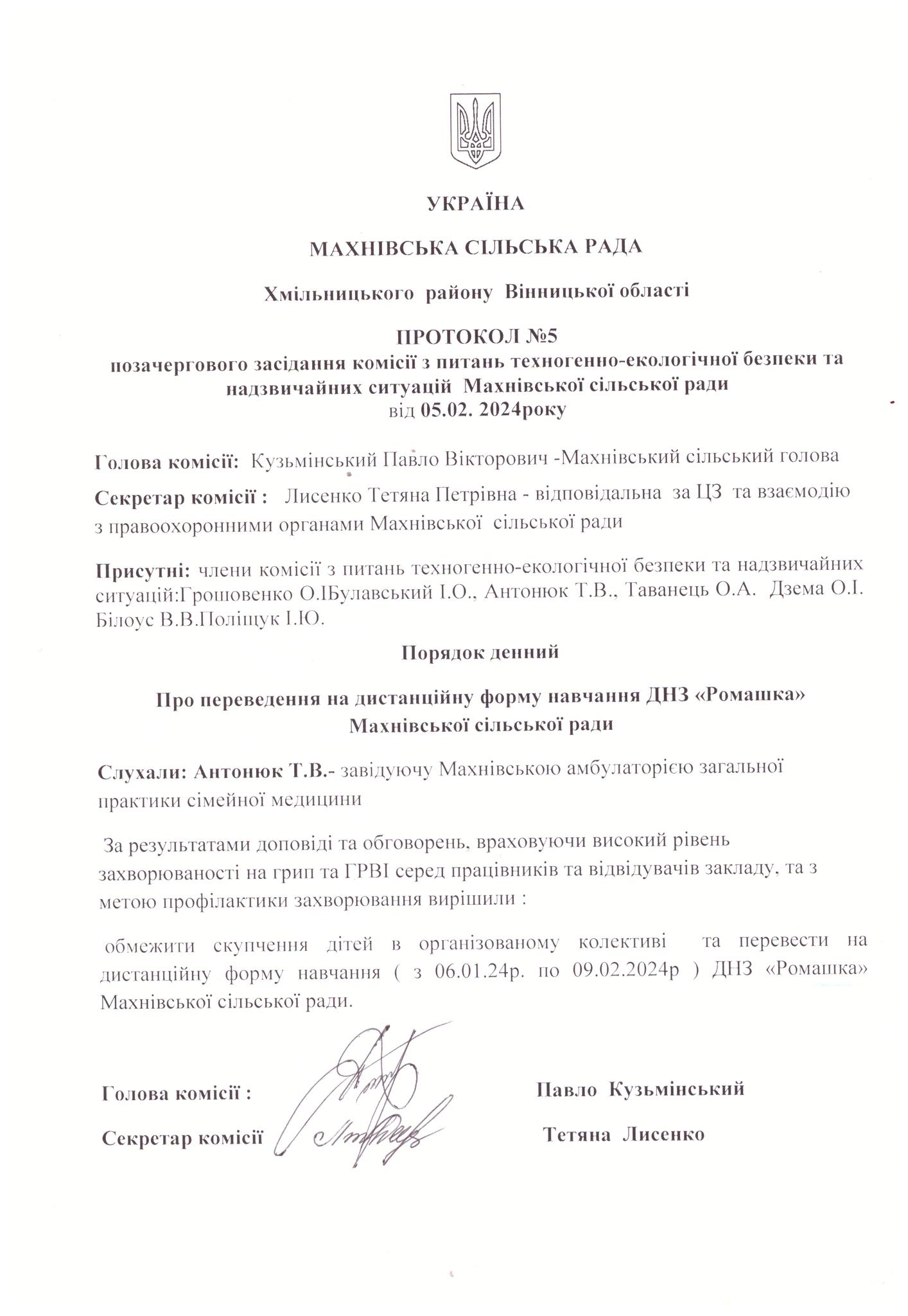 За результатами доповідей та обговорень, враховуючи високий рівень захворюваності на грип та ГРВІ серед працівників та відвідувачів дошкільного навчального закладу «Ромашка», вирішили обмежити скупчення дітей в колективі та перевести його на дистанційну форму навчання. З 6 по 9 лютого.