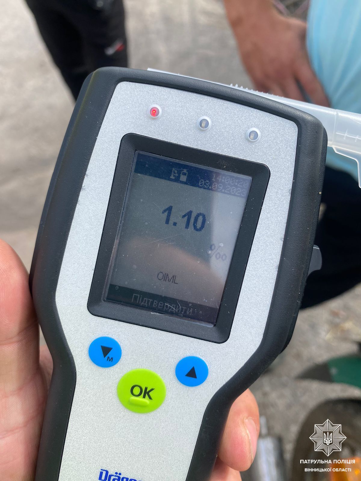 — Під час спілкування із порушником патрульні помітили в нього ознаки алкогольного сп'яніння. Спецприлад Drager показав, що в організмі кермувальника було 1,10 проміле алкоголю. Це у 5, 5 разів перевищує допустиму норму, — підкреслюють у повідомленні поліції.