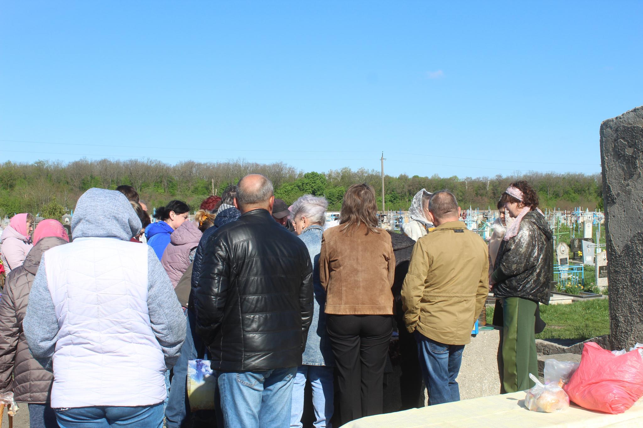 На кладовищі спочатку священник освятив могили воїнів, потім була пауза, викликана повітряною тривогою, а після ще одної заупокійної молитви став освячувати поховання померлих по рядах. В проміжку між цими двома етапами, в небі був помічений ворожий шахед. Спочатку в небі пролунав гучний та далекий вибух. І відразу почувся гул літака, який миттю тому так влупив по летючому апарату орків, що шахед перетворився у небі на маленьку хмаринку.