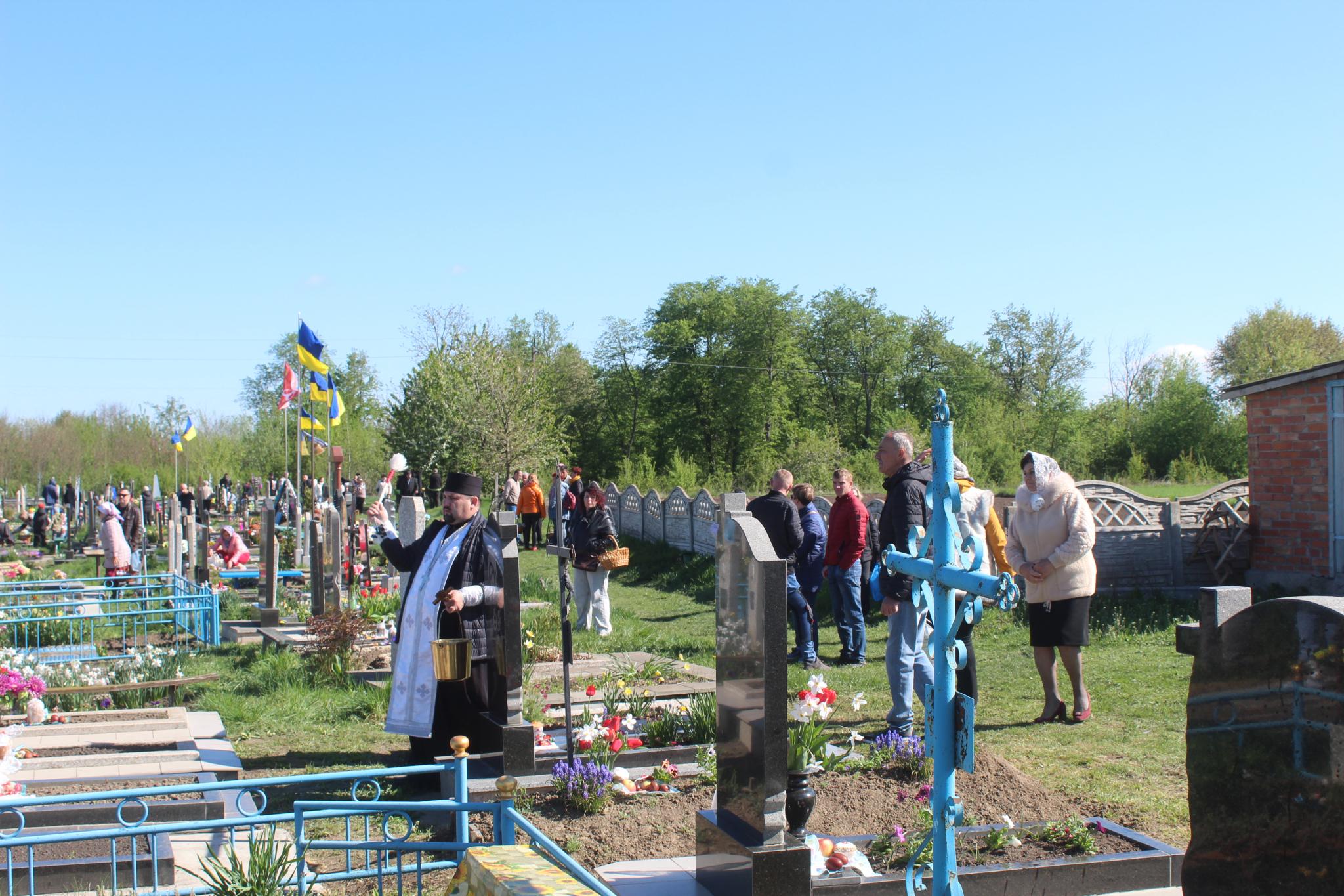 Провівши службу біля постаменту отець Василь став освячувати могили померлих по рядах.