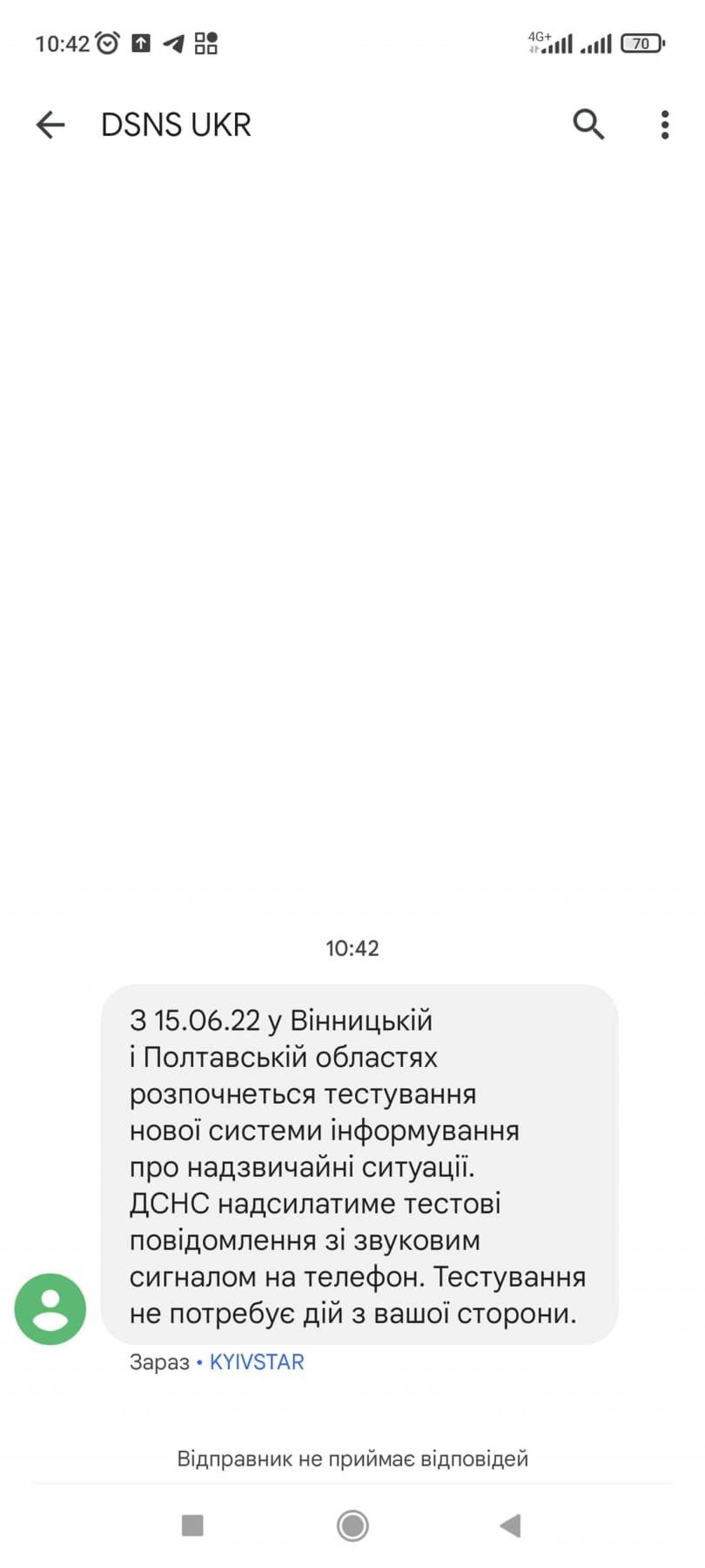 Наразі ДСНС надсилатиме лише тестові інформаційні повідомлення на мобільні телефони такого змісту: «ДСНС України. Тестування системи інформування населення».