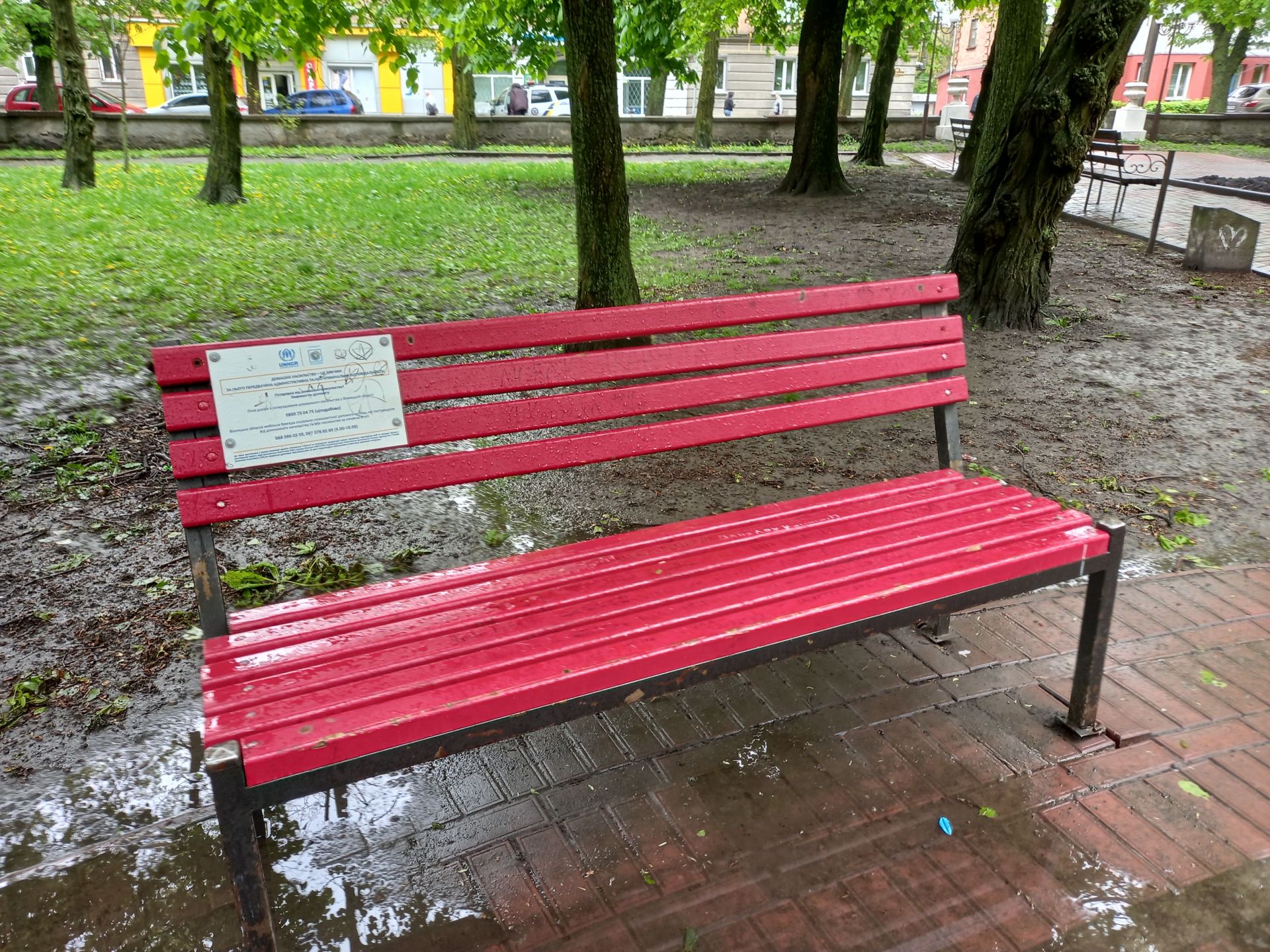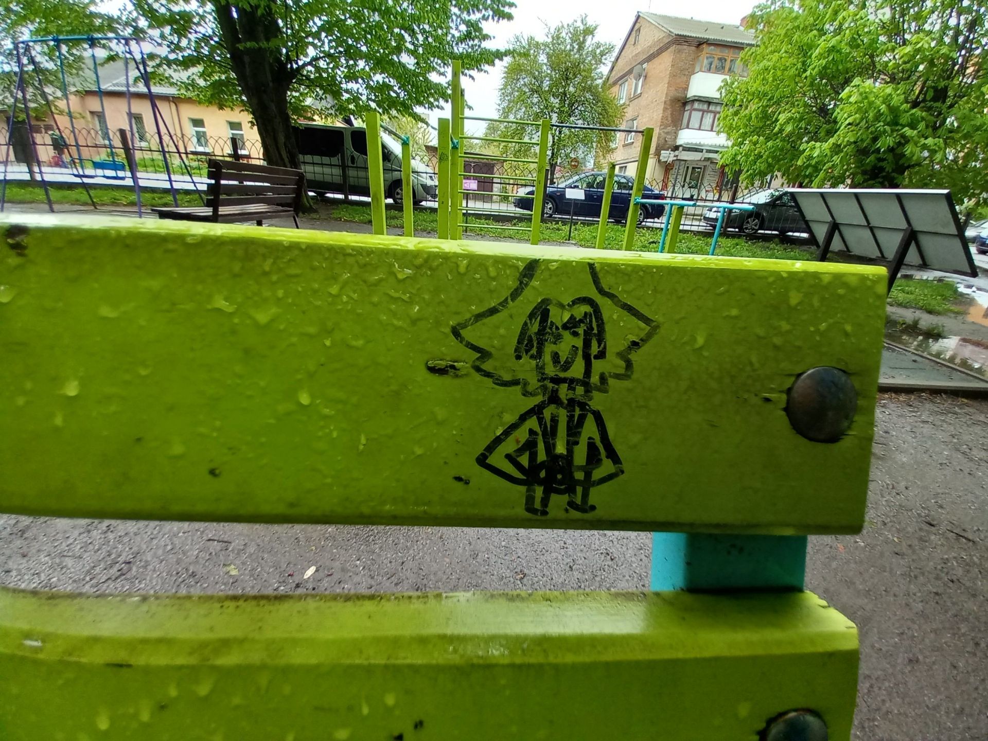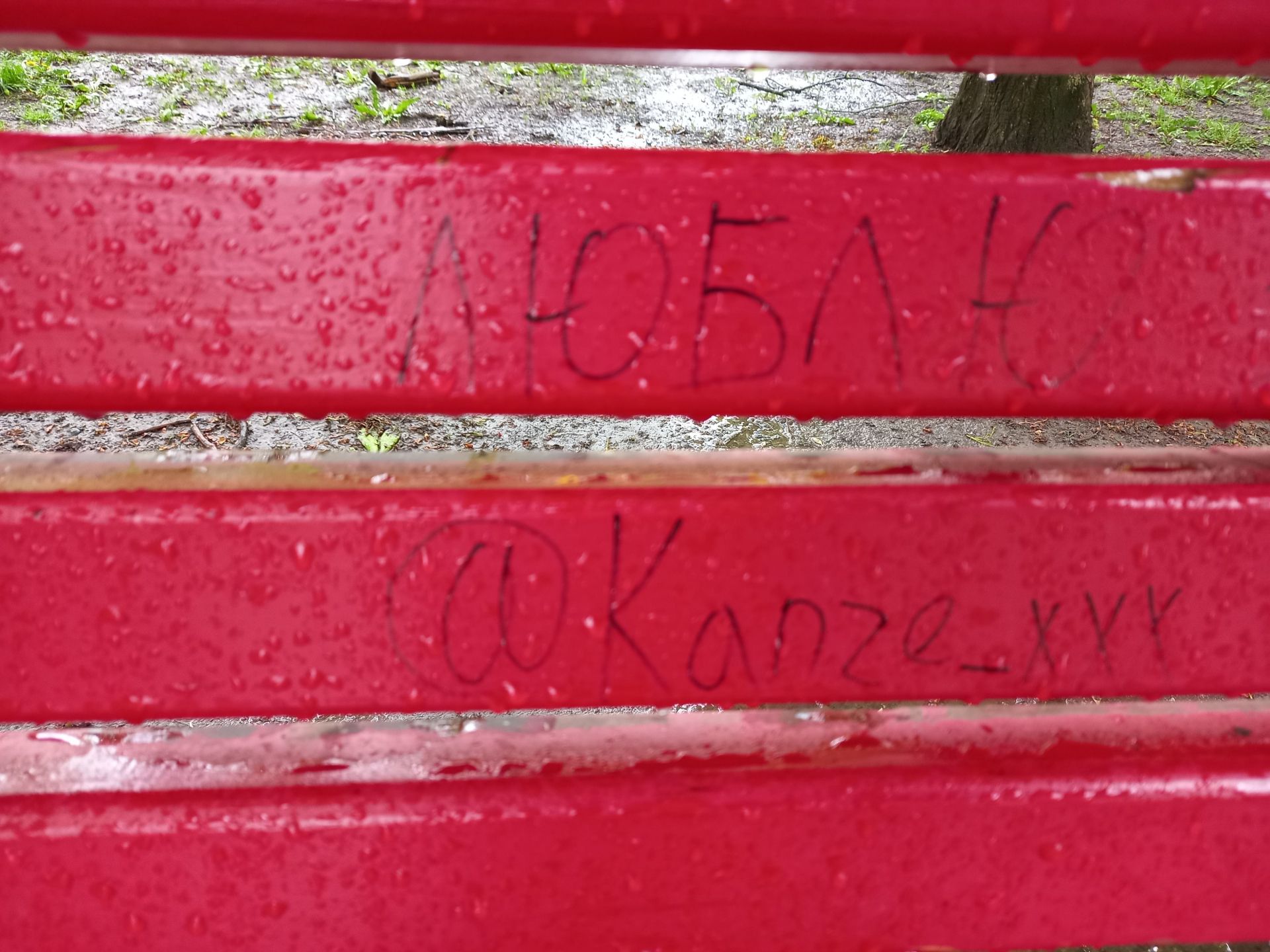 — Та червона лавка взагалі вся помальована, — показує Настя. — З усіх лавочок вона постраждала найбільше. Тут і непристойності, і пентаграма. Альтанка теж вся розмальована. Так само, як і гірка-паровоз на дитячому майданчику — вона розписана і зовні, і зсередини. Але якщо її фотографувати, доведеться усе ретушувати, тому що там непристойності.