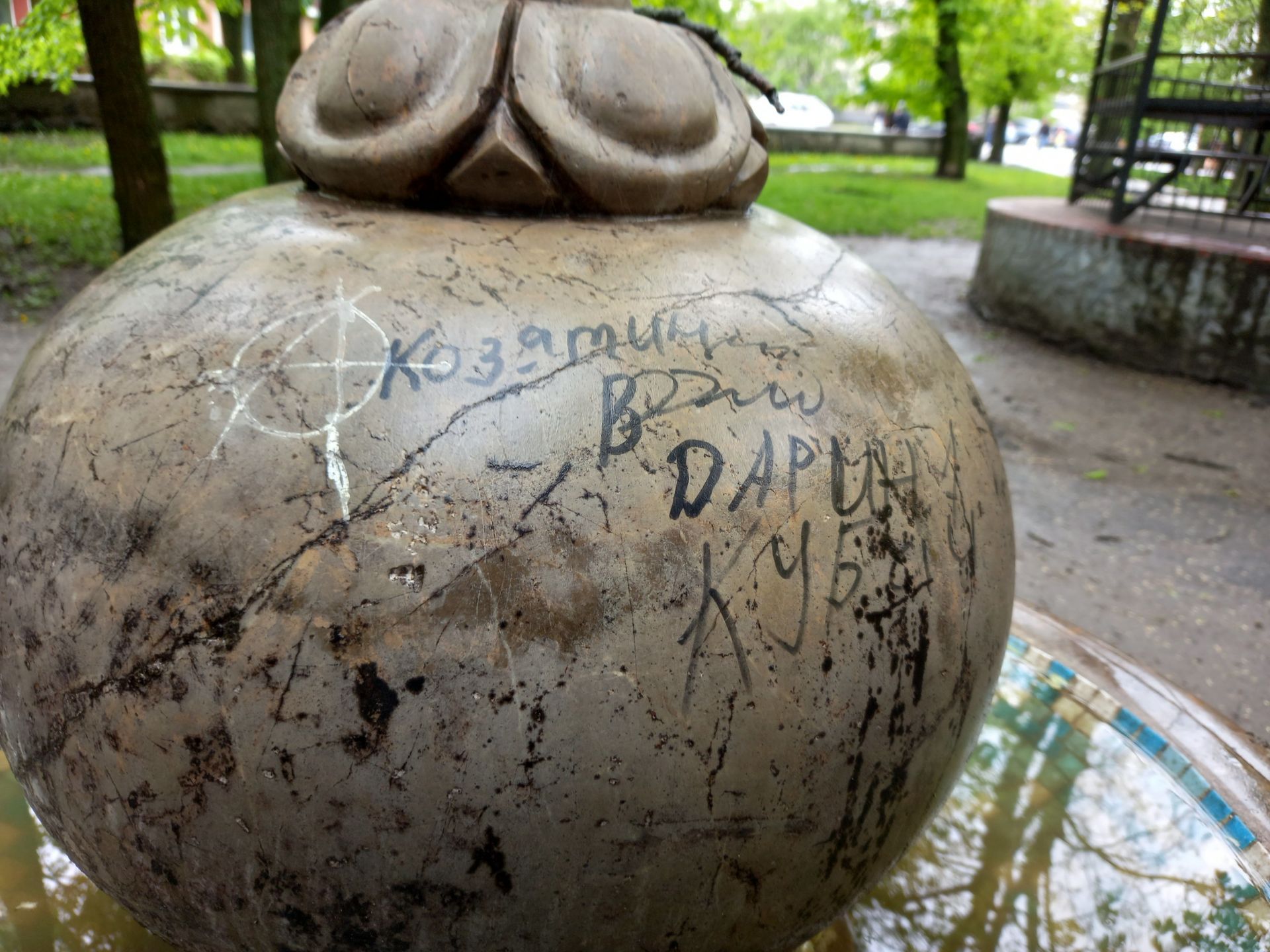 Зачепили навіть фонтан. Він теж розписаний з усіх боків. Настя каже, минулого літа було ще гірше — це вже трохи відмили.