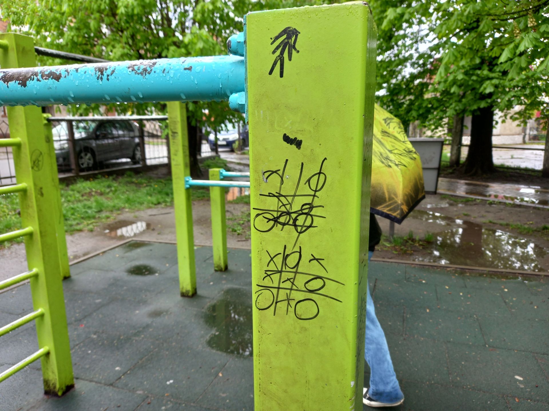 — Запам’ятайте — куріння шкодить здоров’ю, — читає вголос Настя один із написів на турніку. — Тут і писали, що продають щось, і в хрестики-нулики грали. Малюнки, ще малюнки, телефони. На лавках для занять спортом теж є, але не суперсильно. Ось я впізнала зображення з мультфільму «Metal Family». Там батько, мати, діти — всі слухають важку музику, але цей мультик російський.