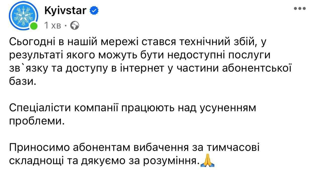 Близько 13.00 з'явилася офіційна інформація від «Київстар».
