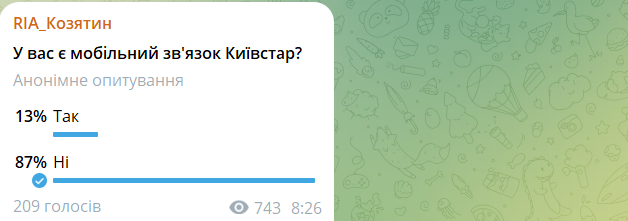 Ми робили опитування у нашому телеграм-каналі. Запитували, чи є мобільний зв'язок Київстар? Проголосувало понад 200 читачів. У більшості він не працює.