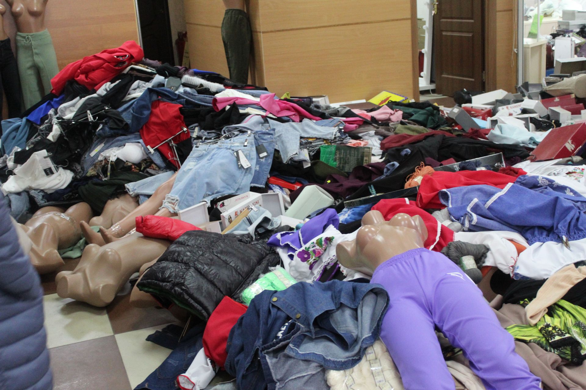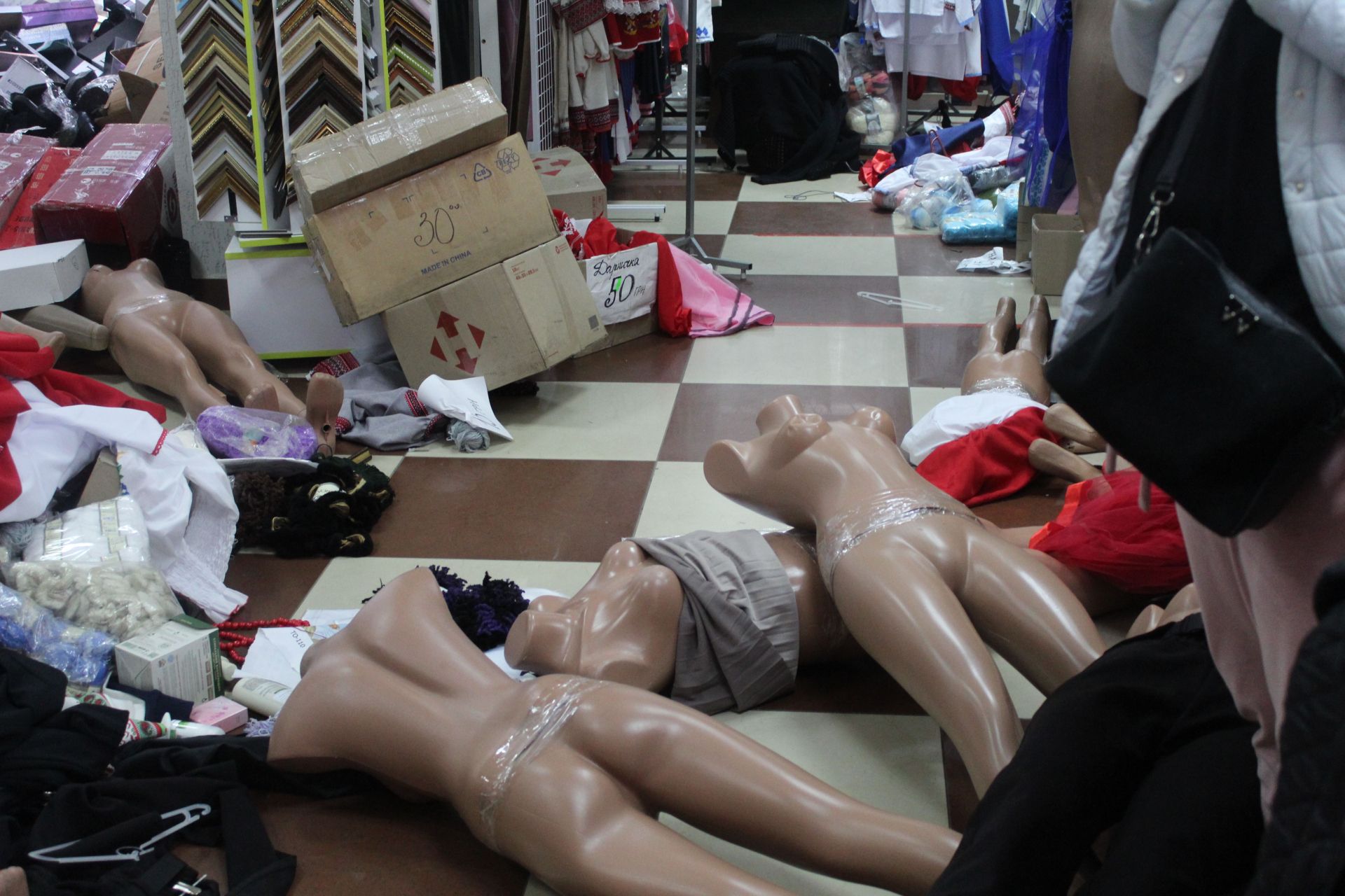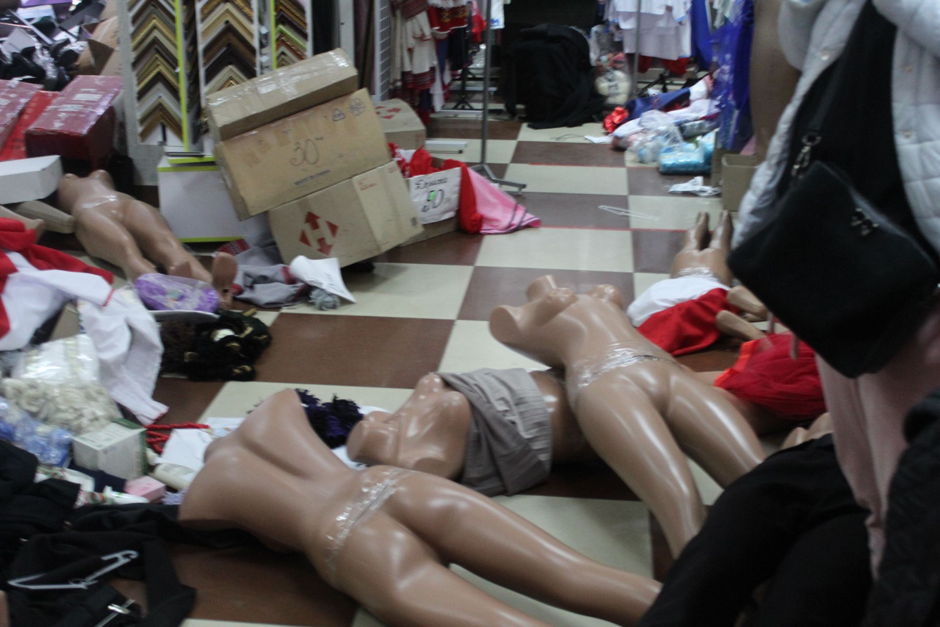 Коли ми приїхали за вказаною адресою, то орендарі і продавці «Флешу» та правоохоронці, які також приїхали за викликом чекали на слідчо-оперативну групу. Представниці торгівлі юрбились на східцях між першим та другим поверхом, а біля них страж порядку з автоматом. Коли оперативники прибули на місце події, то спочатку прийняли заяви від потерпілих. Після чого почалися слідчі дії та перепис майна, яке було знесено з відділень на середину зали.