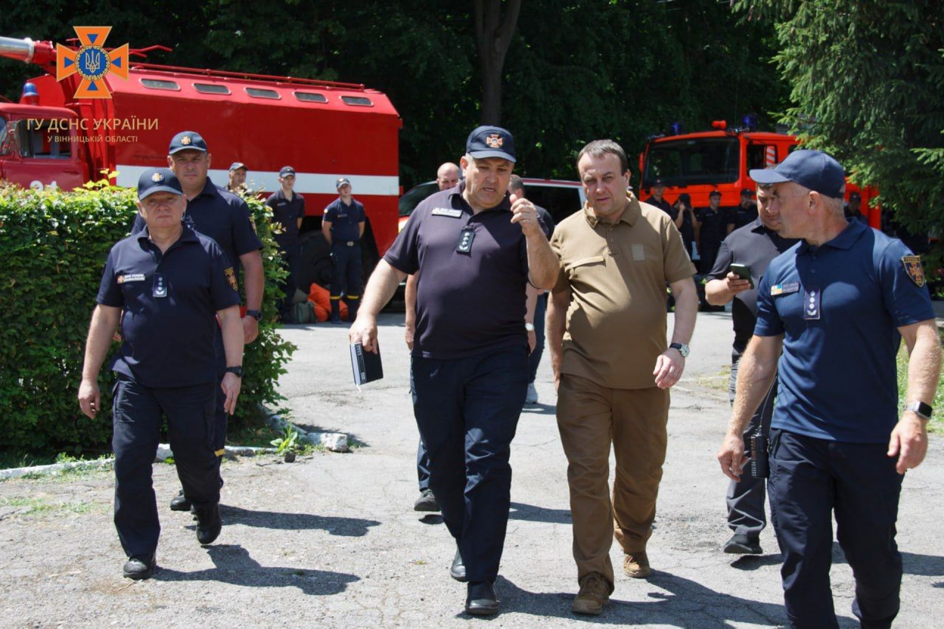 Очільник ГУ ДСНС України у Вінницькій області Руслан Шевчук спільно із начальником обласної військової адміністрації Сергієм Борзовим перевірили спецтехніку та аварійно-рятувальне обладнання, готовність сил і засобів зведеного загону до гасіння складних пожеж та виконання значних обсягів робіт із ліквідації наслідків надзвичайних ситуацій, відпрацювання спільних дій підрозділів та спеціальних служб під час гасіння умовних пожеж на хімічно-небезпечних підприємствах.
