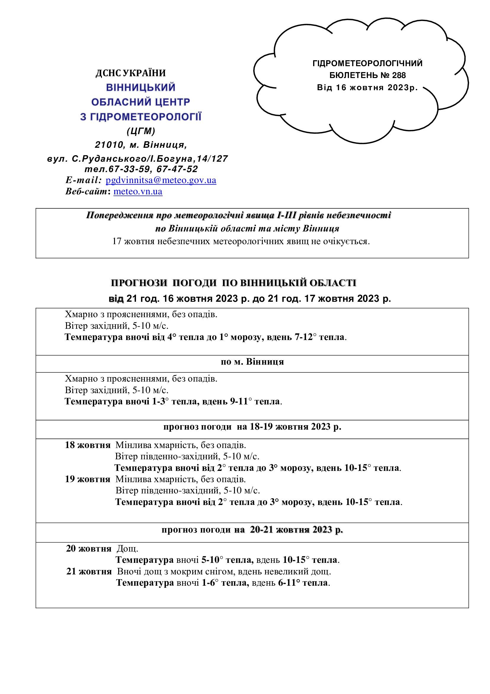 За прогнозами обласних синоптиків завтра, 17 жовтня по Вінницькій області буде хмарно з проясненнями, без опадів. Вітер західний, 5-10 м/с. Температура вночі від 4° тепла до 1° морозу, вдень 7-12° тепла.