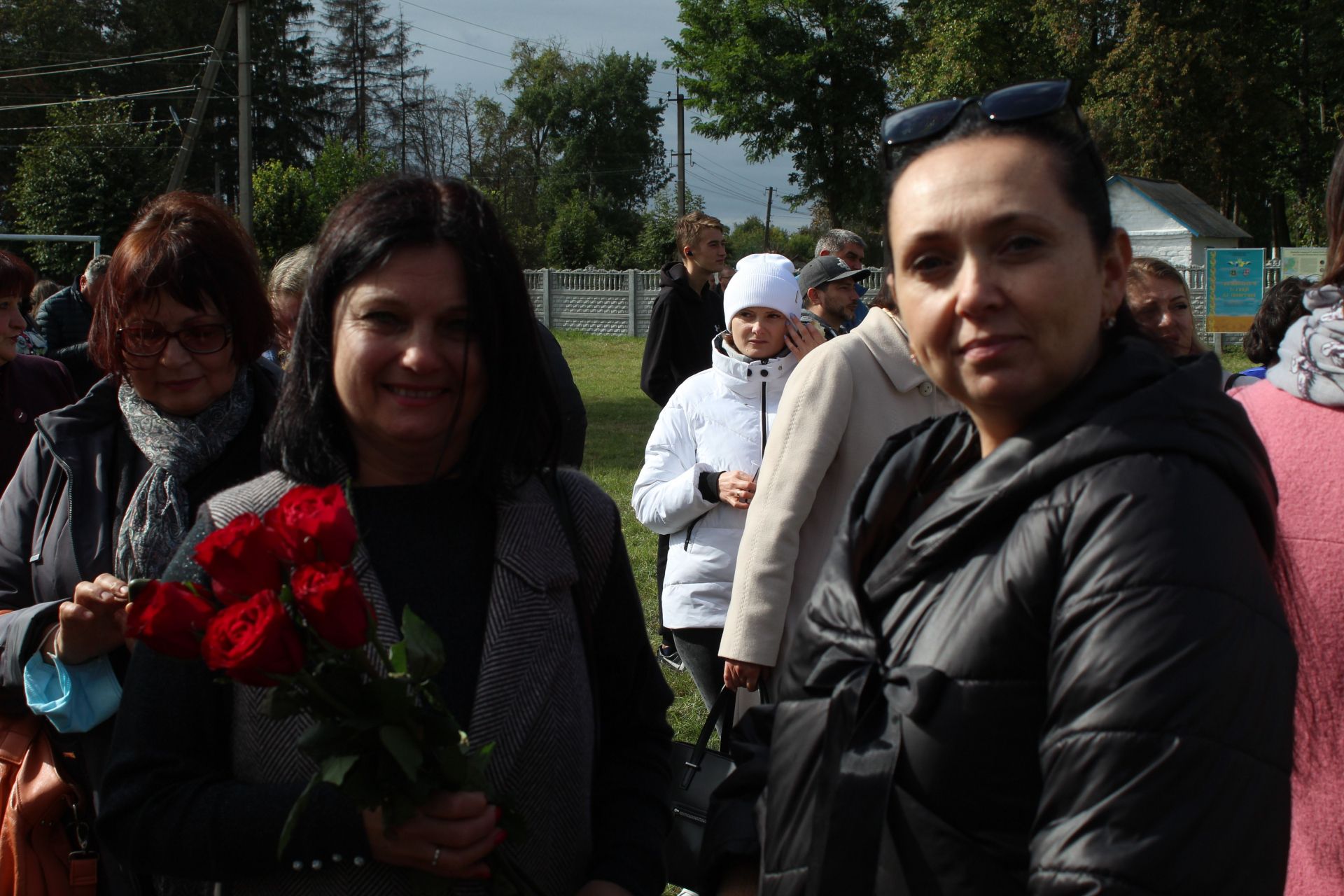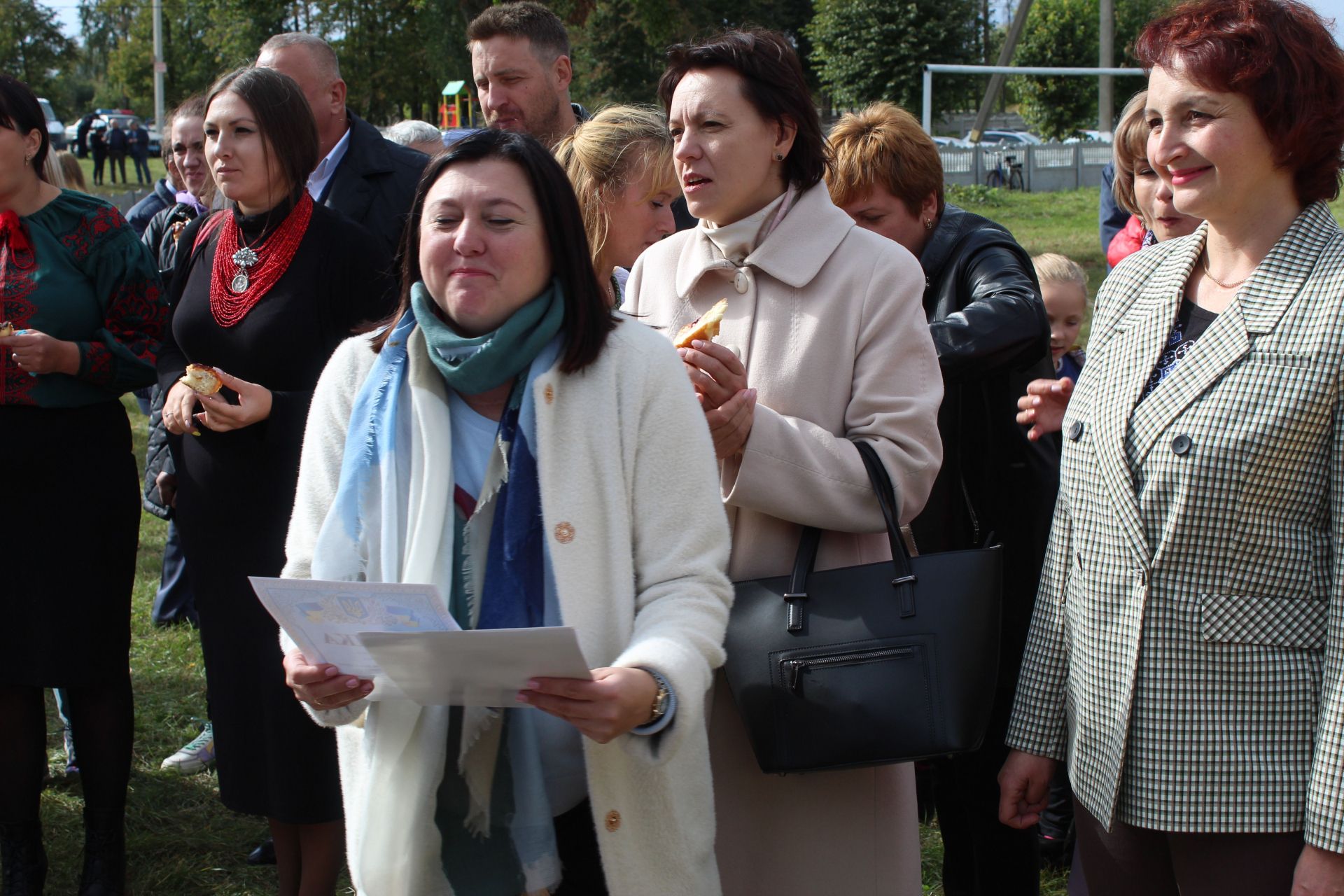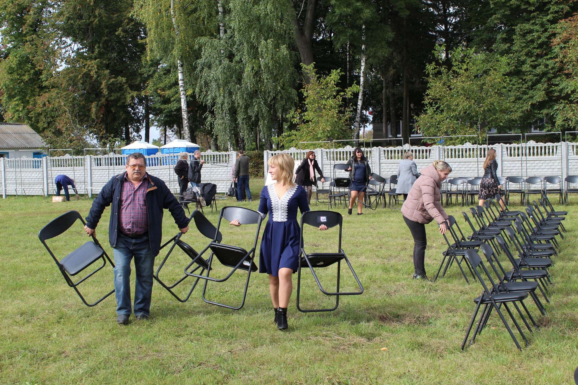 А тим часом на стадіоні змайстрували велику сцену. Педагогічний колектив рознесли 200 стільців для гостей. І без того рівні їх рядки поправлялаще рівніше одна із співробітниць учбового закладу.