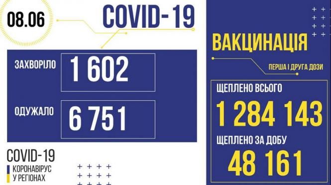 Загалом в Україні за добу одужали 6 751 людини. Захворіли – 1 602. Померли – 118. Щеплено – 43 137 + 5 024. Загалом проведено 1 284 143 вакцинацій.