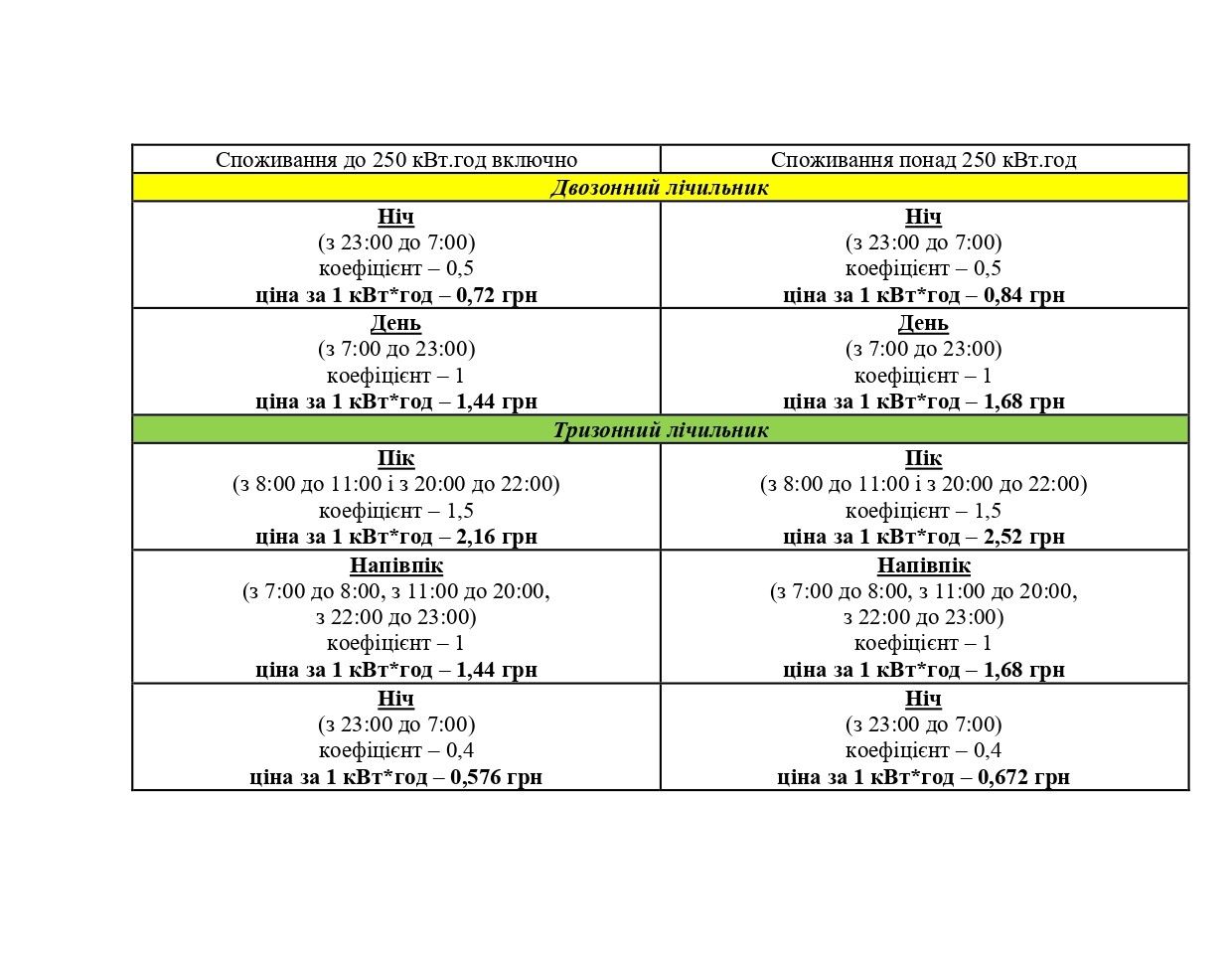 - для індивідуальних побутових споживачів, які споживають до 250 кВт.год (включно) на місяць – 1,44 грн за 1 кВт.год. для споживачів, які використовують більше 250 кВт.год на місяць – 1,68 грн за 1 кВт.год (за весь обсяг споживання).