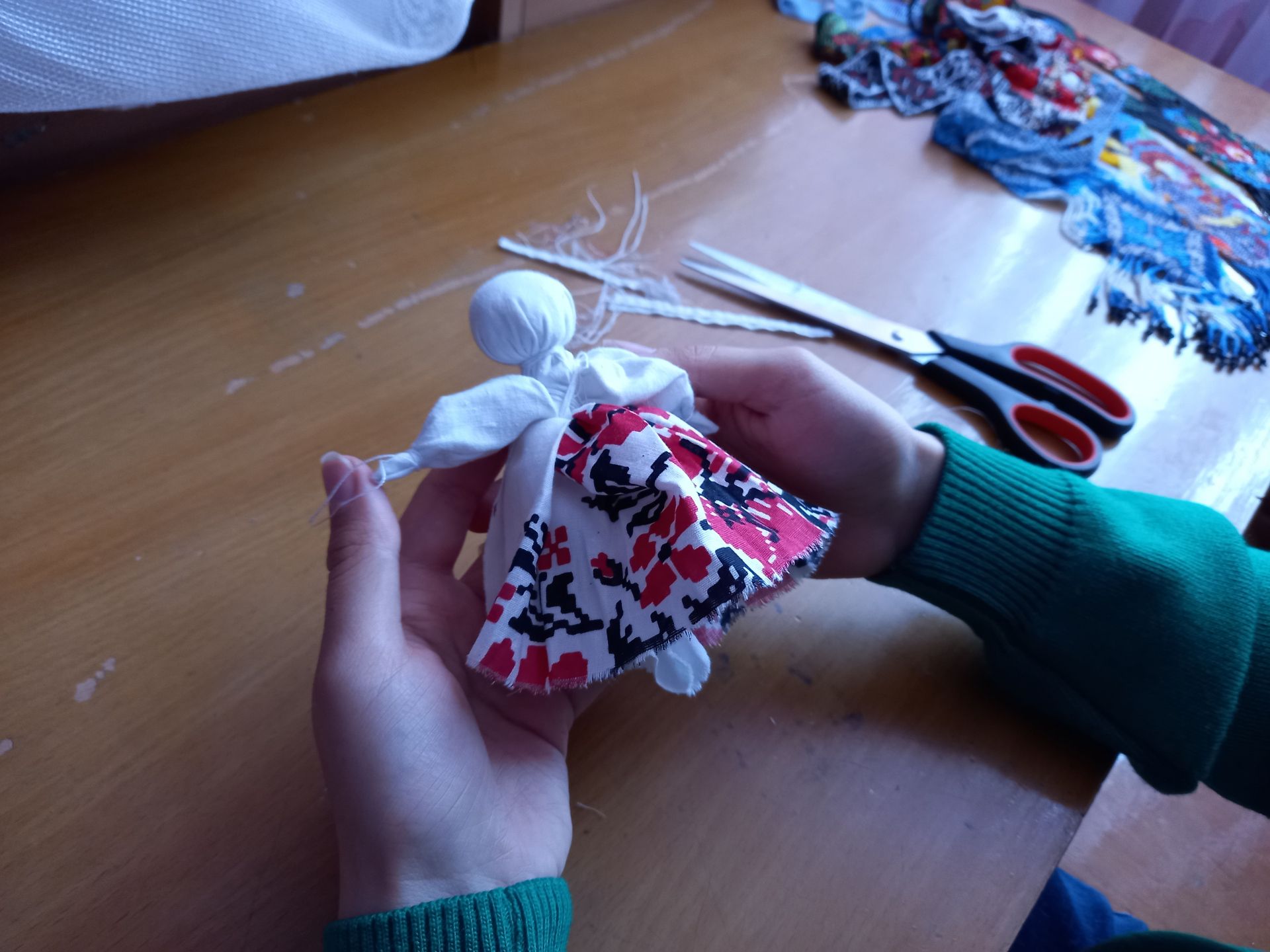 Основа ляльки — це квадратний шматок тканини. По його центру майстриня кладе невеличку ватяну кульку, а тоді квадрат, розвернутий по діагоналі, складає навпіл. На тканину навколо ватяної кульки туго намотують нитку. Так формується голова майбутньої ляльки. Маша, яка прийшла на заняття, уважно слідкує за процесом і повторює кожен рух.