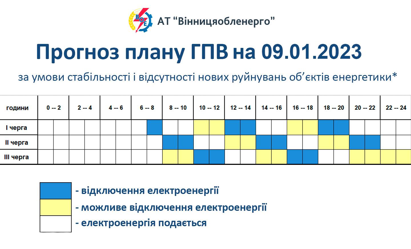 — Відповідно до доведеної граничної величини споживання електричної потужності на 09.01.23 р. по Вінницькій області задіяли обмеження електроспоживання відповідно до графіка погодинного відключення ГПВ, — повідомляють у Вінницяобленерго
