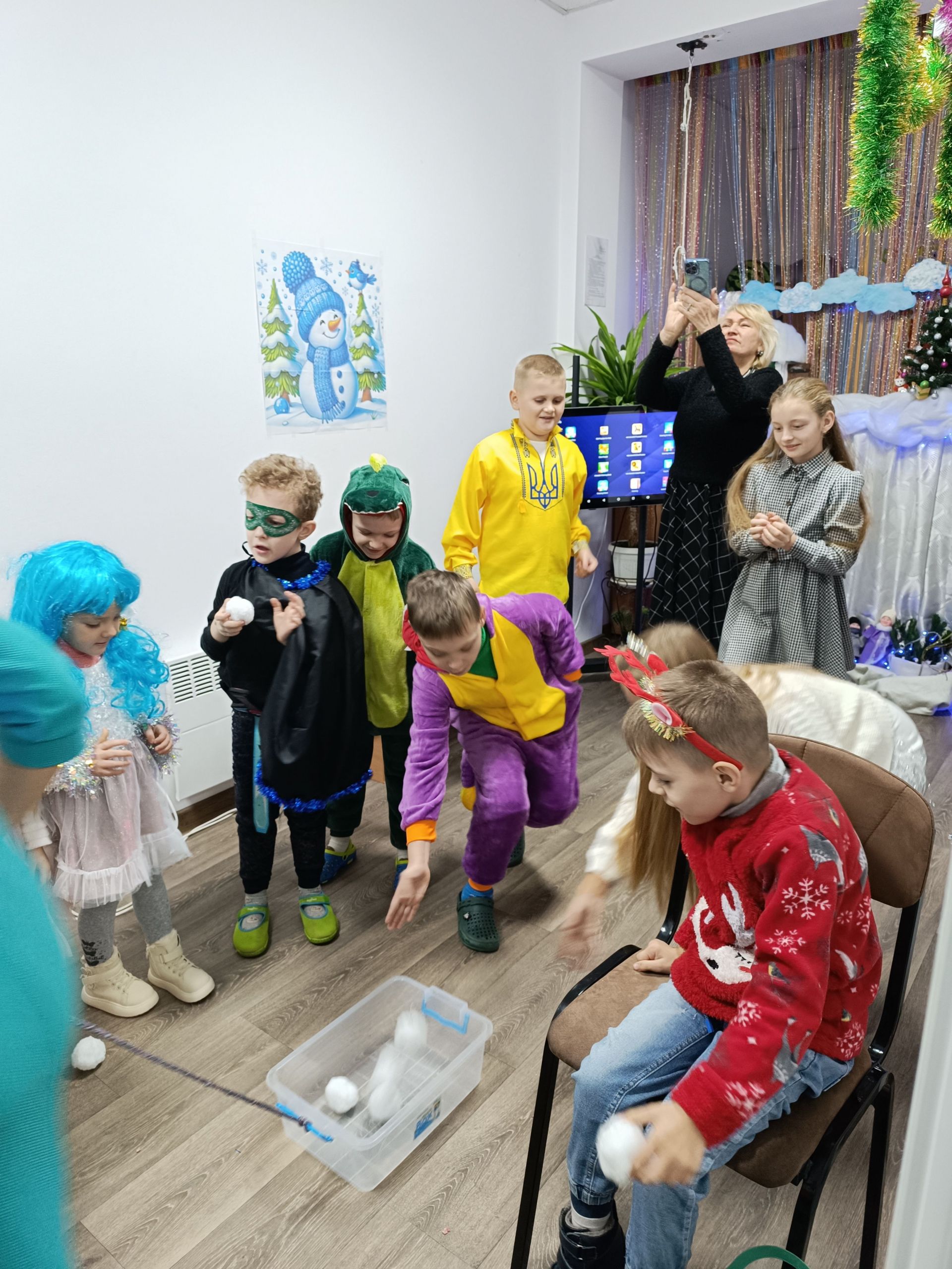 Настав час для гри. Хлопчики з дівчатками діляться на дві команди і шикуються. Капітани отримують у руки сніголіпи. У кімнаті чотири кошики. Два пустих стоять поруч із дітьми, два інших кошики повні сніжок. Не справжніх звісно, а ватяних. За допомогою сніголіпа вихованцям центру потрібно перемістити всі сніжки з одного кошика в інший. Діти успішно завершують цю місію і одержують наступне завдання — потрапити сніжкою до кошика. Кожен по-черзі кидає штучною сніжкою.