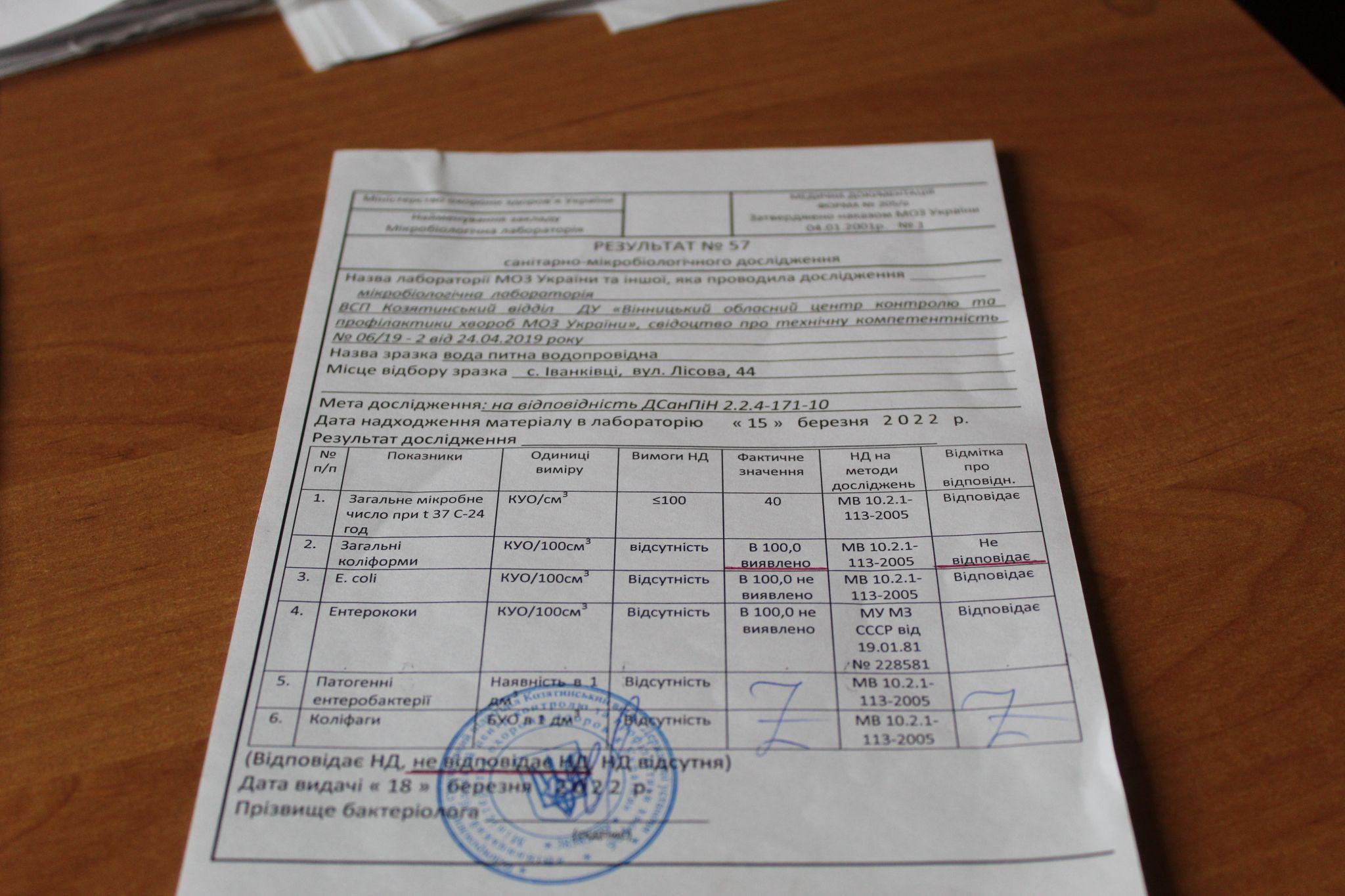З цим питанням ми звернулися до керівника Козятинського відділу контролю та профілактики захворювань Леоніда Ящука. Тоді він розповів, що до нього вже звертався помічник народного депутата Петра Юрчишина Олег Каменний. Леонід Ящук пообіцяв, що проби води на якість у Іванківцях буде проведено. В кінці березня минулого року проби води взяли, а результати перевірки направили в управління Козятинської держспоживслужби, у водний кооператив села Іванковець та помічнику народного обранця Олегу Каменному.