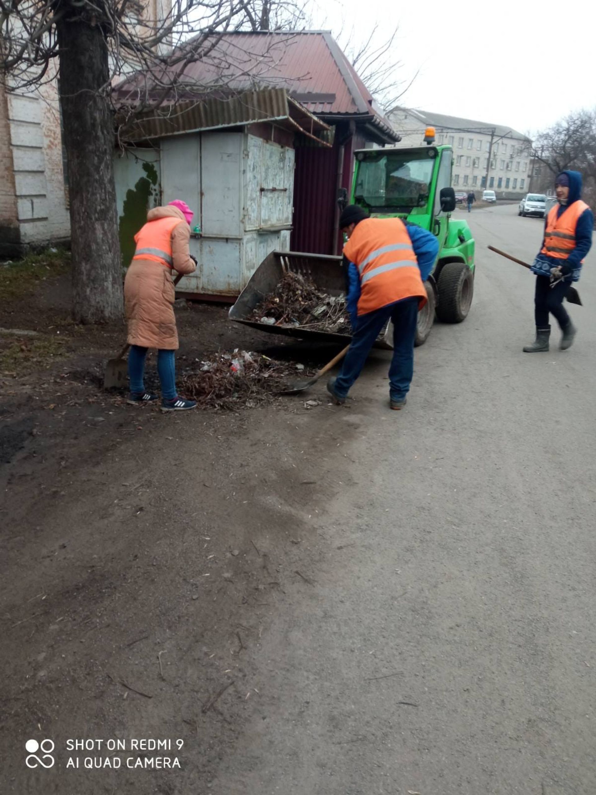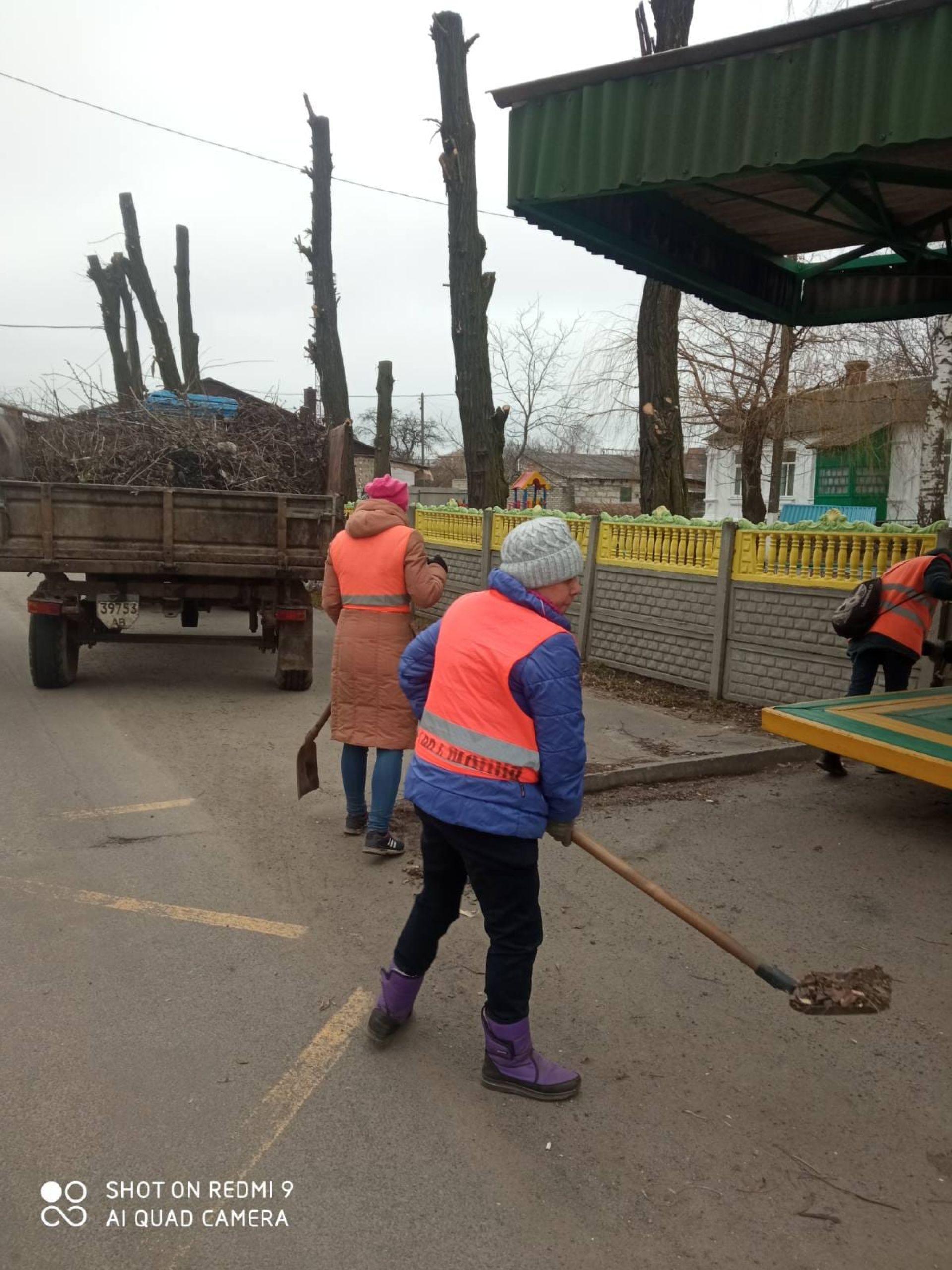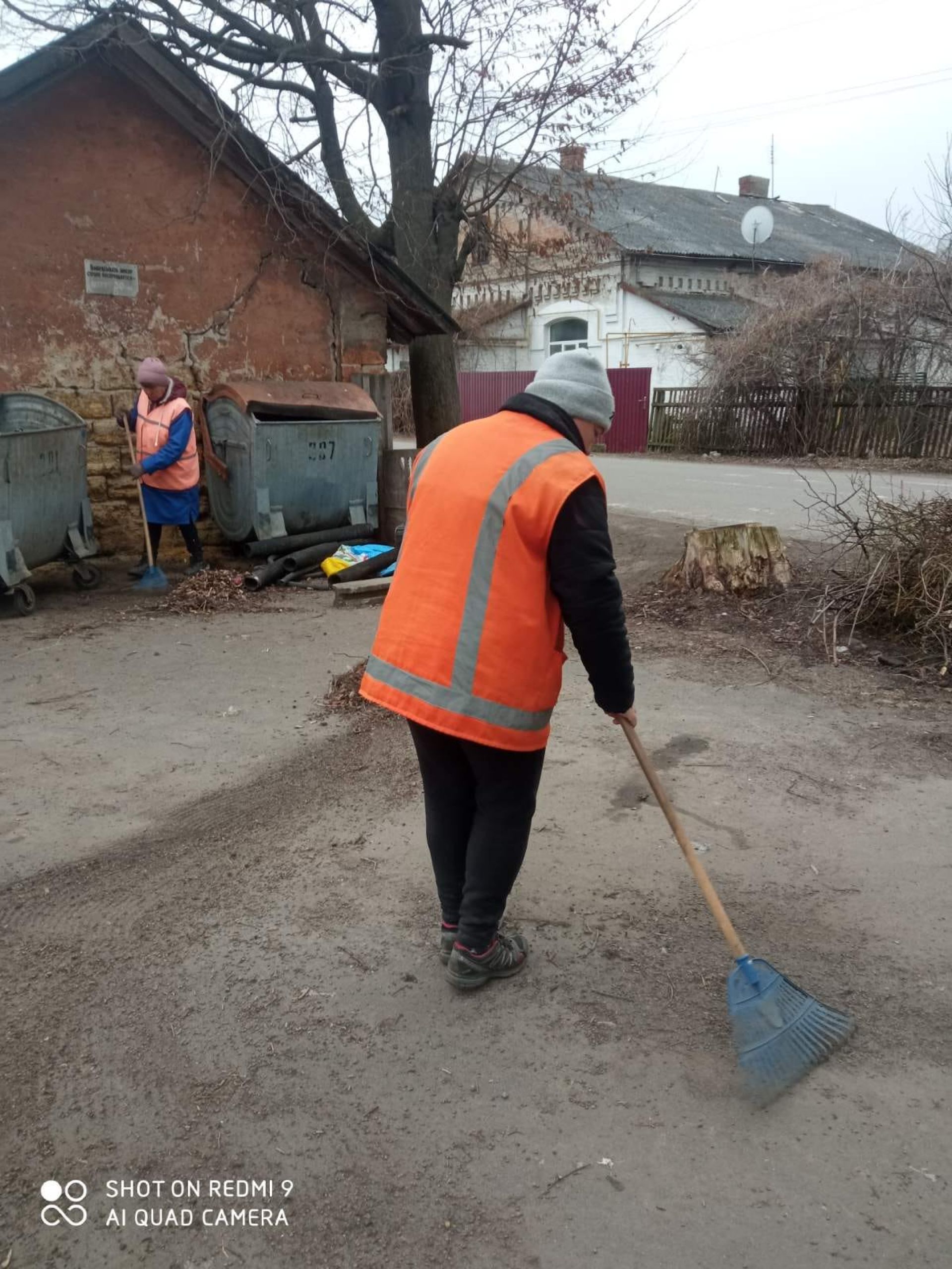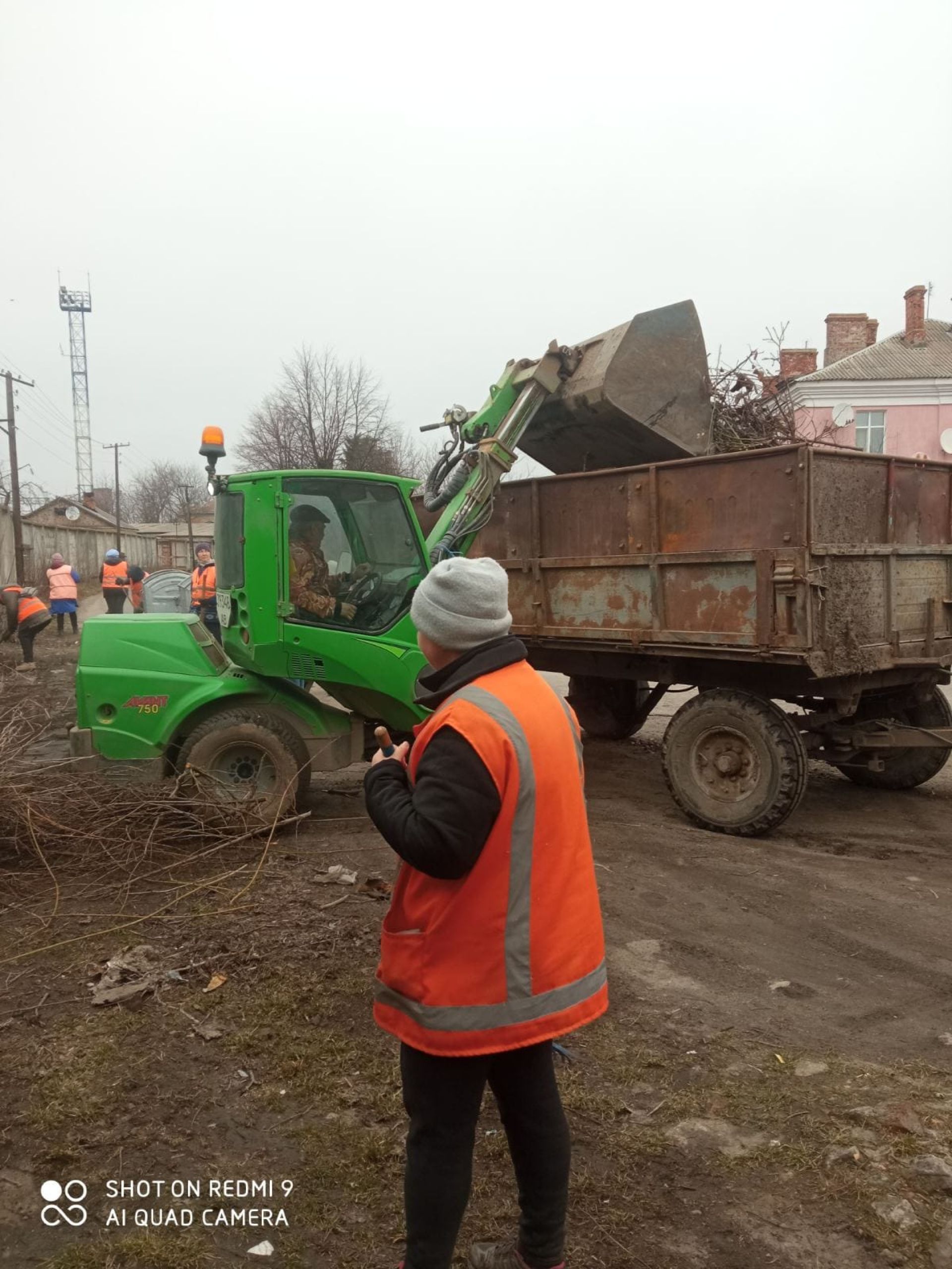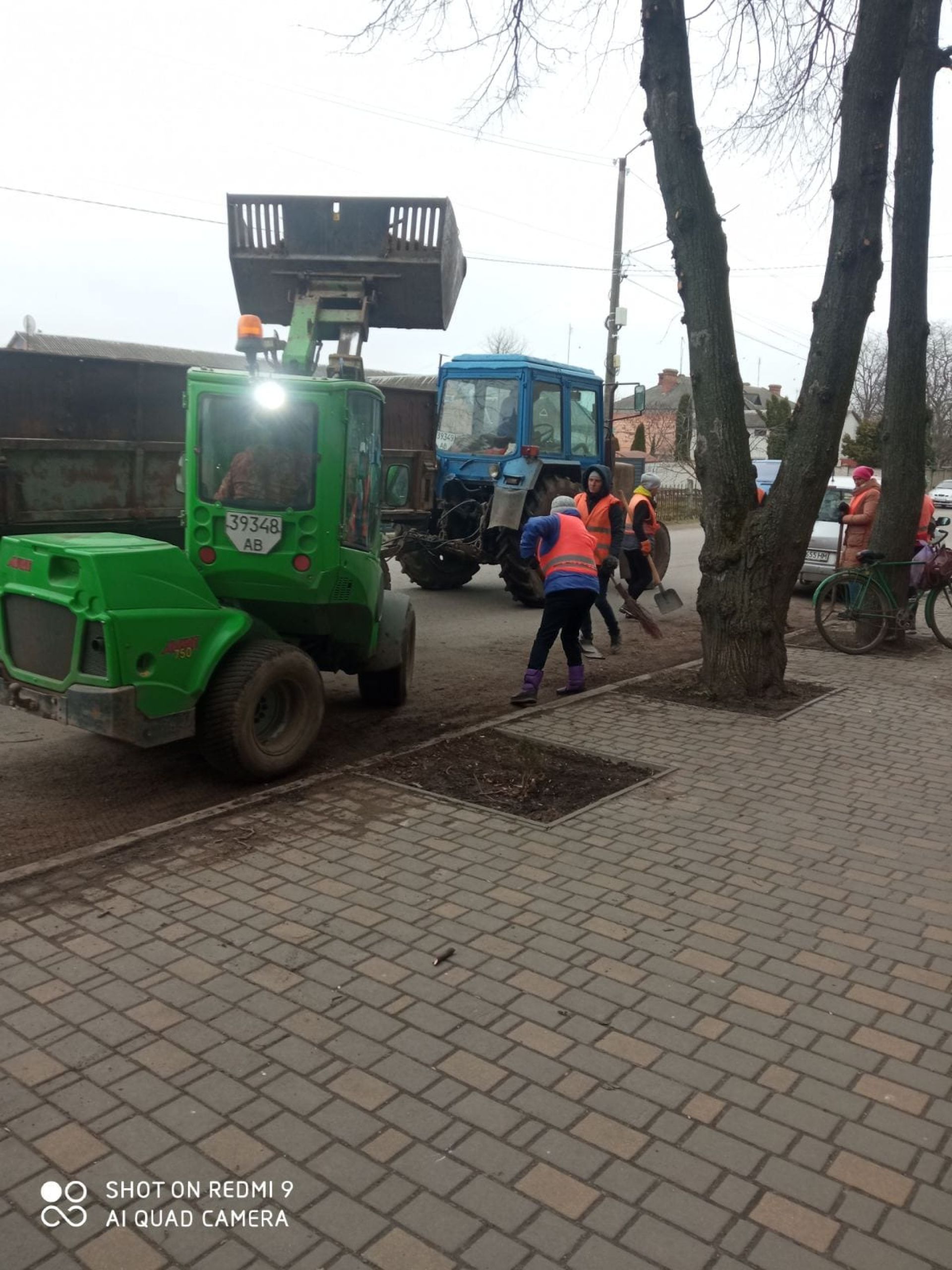 На фото видно, що двірники підмітають вулиці, збирають сміття та сухе гілля. Задіяли і декілька одиниць техніки.