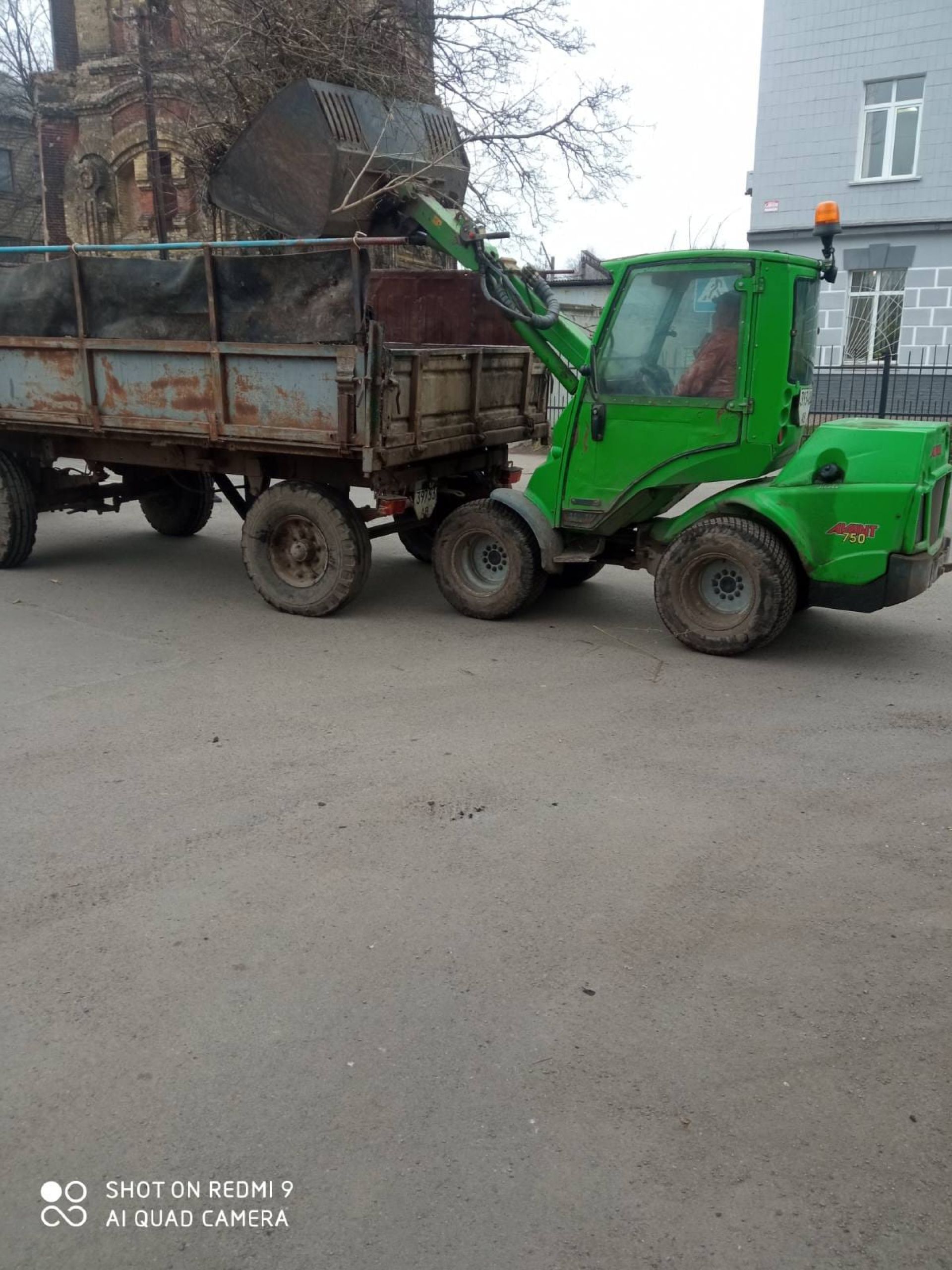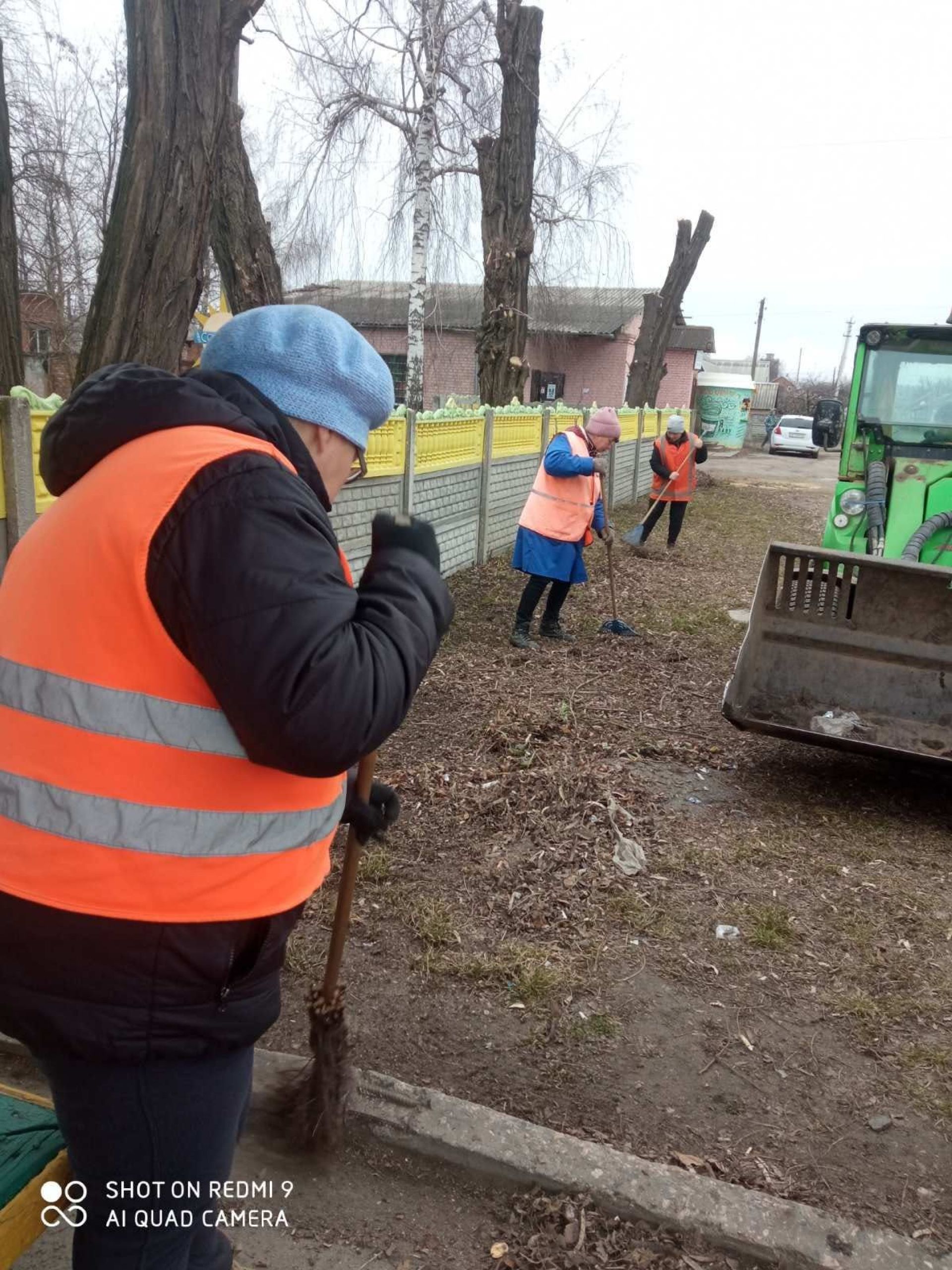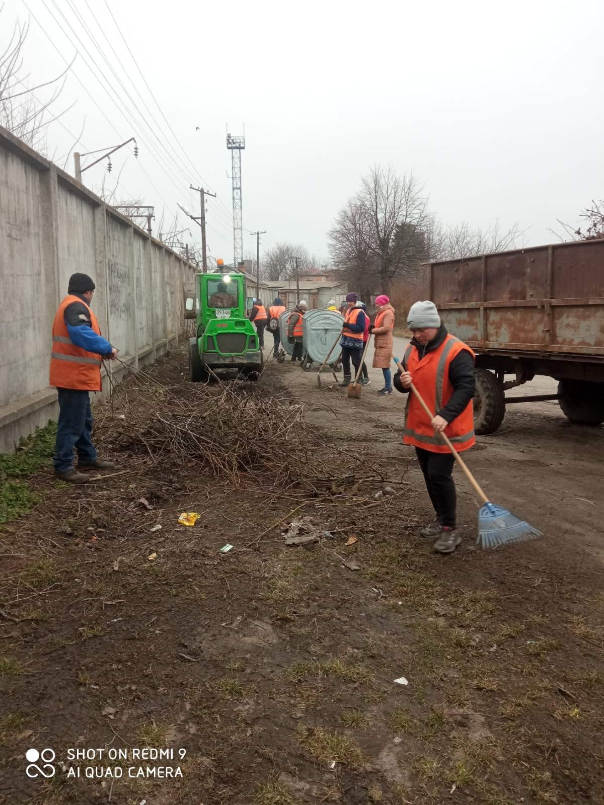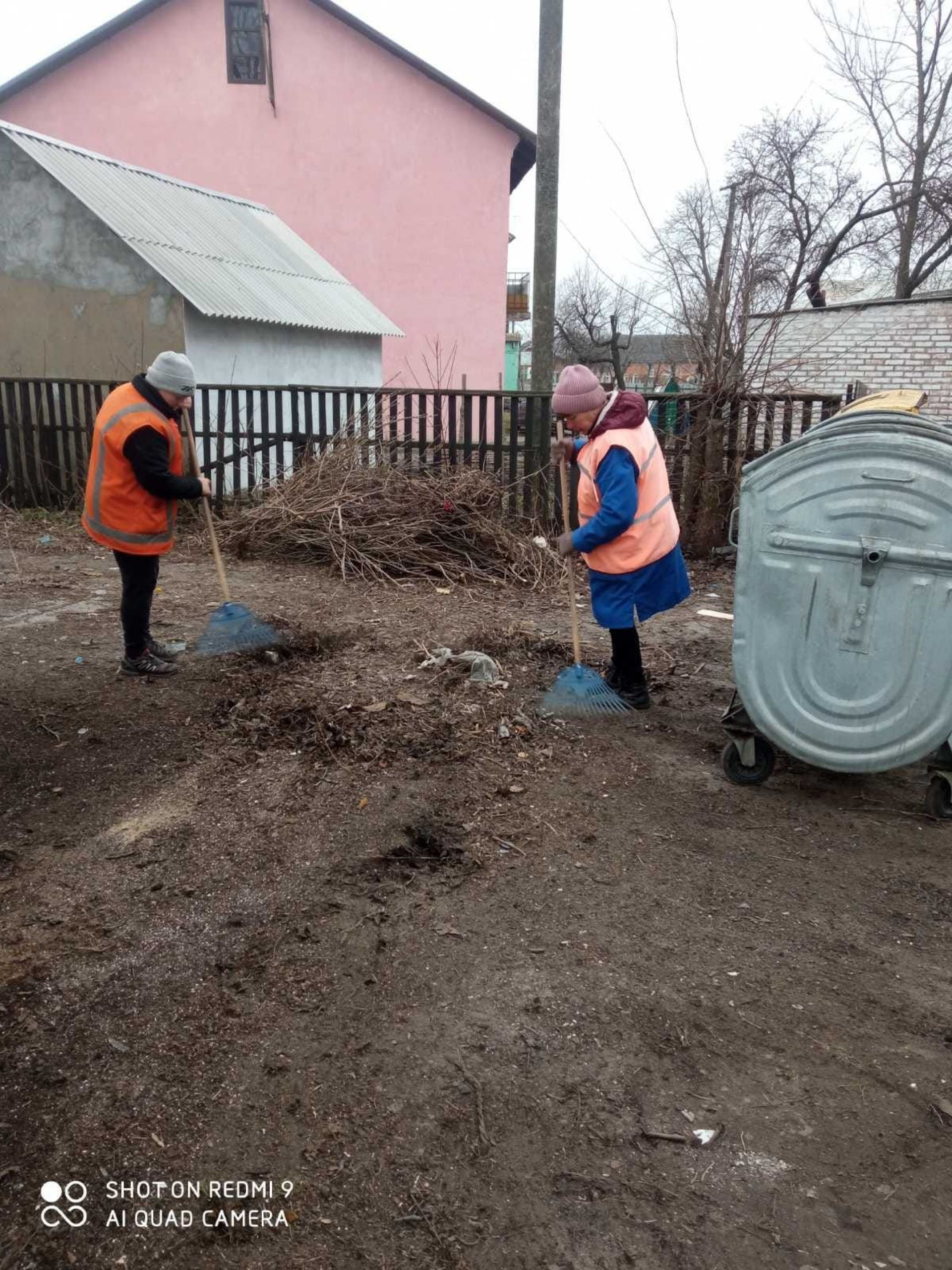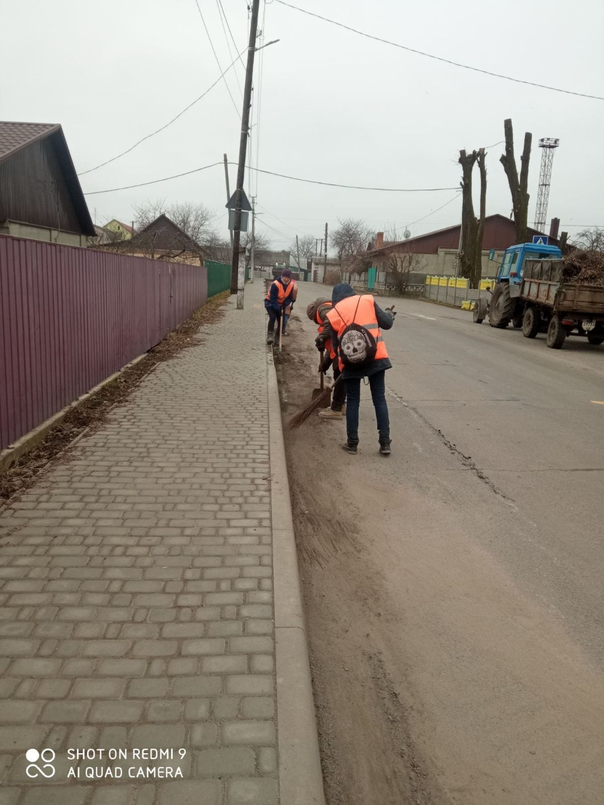 На фото видно, що двірники підмітають вулиці, збирають сміття та сухе гілля. Задіяли і декілька одиниць техніки.