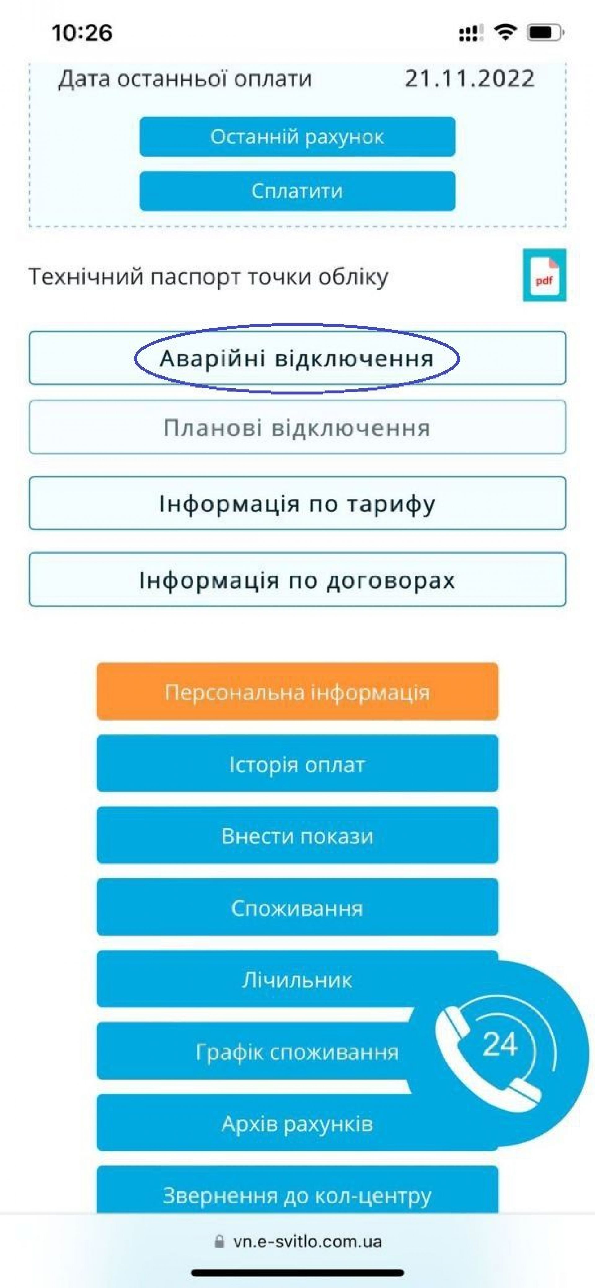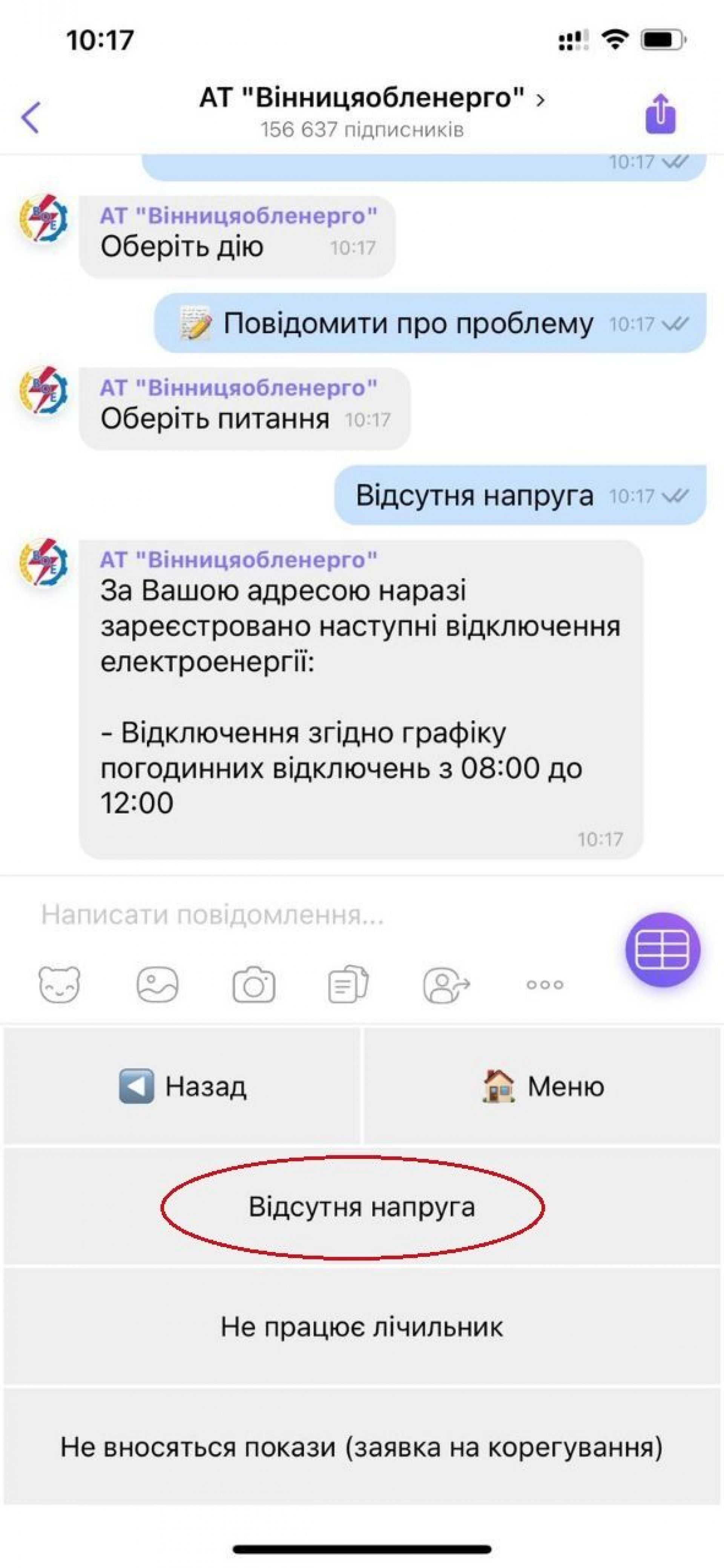 Переглянути планові та аварійні відключення можна в особистому кабінеті на сайті АТ «Вінницяобленерго» https://vn.e-svitlo.com.ua/ та Viber боті https://vb.voe.com.ua/