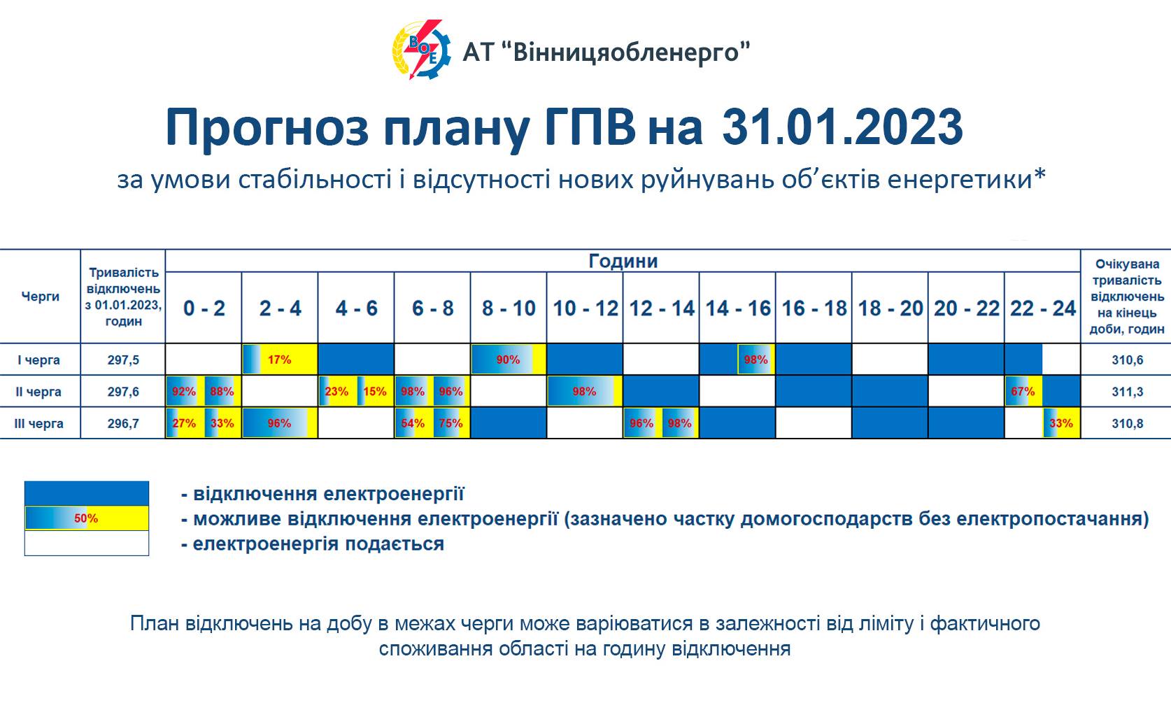 — Відповідно до доведених лімітів Укренерго на 31.01.23 року по Вінницькій області задіяли рівномірне обмеження електропостачання відповідно до графіка погодинного відключення, — повідомляє Вінницяобленерго