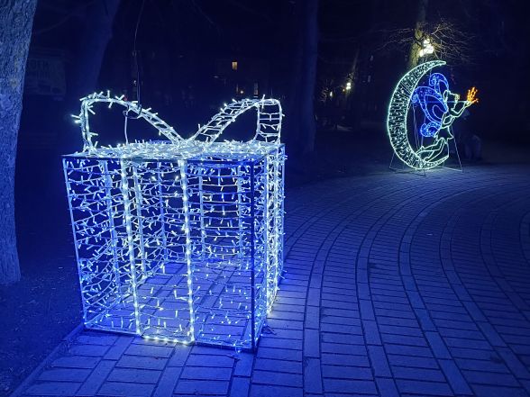 Різдвяне містечко оформили у центрі міського скверу. Основа композиції — кількаметрова ялинка, виготовлена з металевого каркасу і прикрашена великими іграшками. На верхівці — бантик, що сяє червоними вогнями. Новорічну красуню вмонтували навколо квітника. Це вперше у Козятині ставлять штучну ялинку. Адже до початку повномасштабного вторгнення прикрашали живу зелену красуню на площі міста. Додамо, що це також перша ялинка за час великої війни.