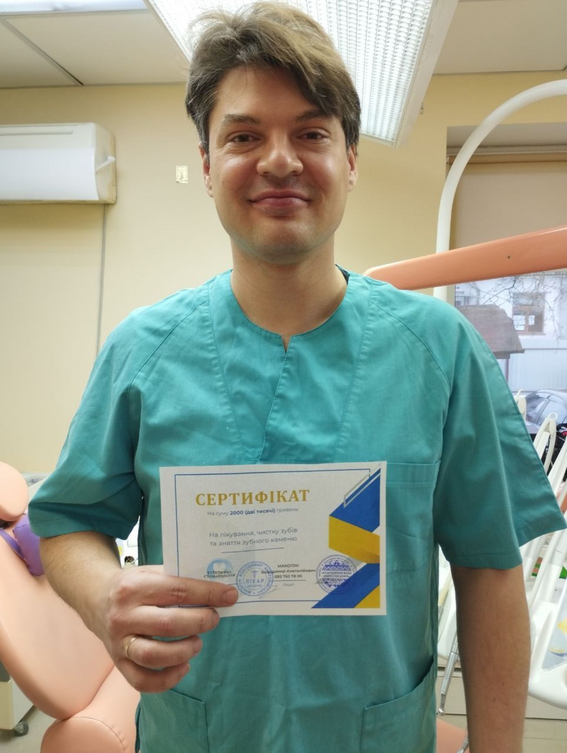 — Маленька, але важлива деталь! Для того, щоб ви не сплачували державний податок на виграний приз із суми 2000 гривень, приз передбачає оплату послуг лікаря-стоматолога за даними сертифікатами в розмірі 1 грн. Лотерейними квитками будуть ваші донати, — додає Сергій.