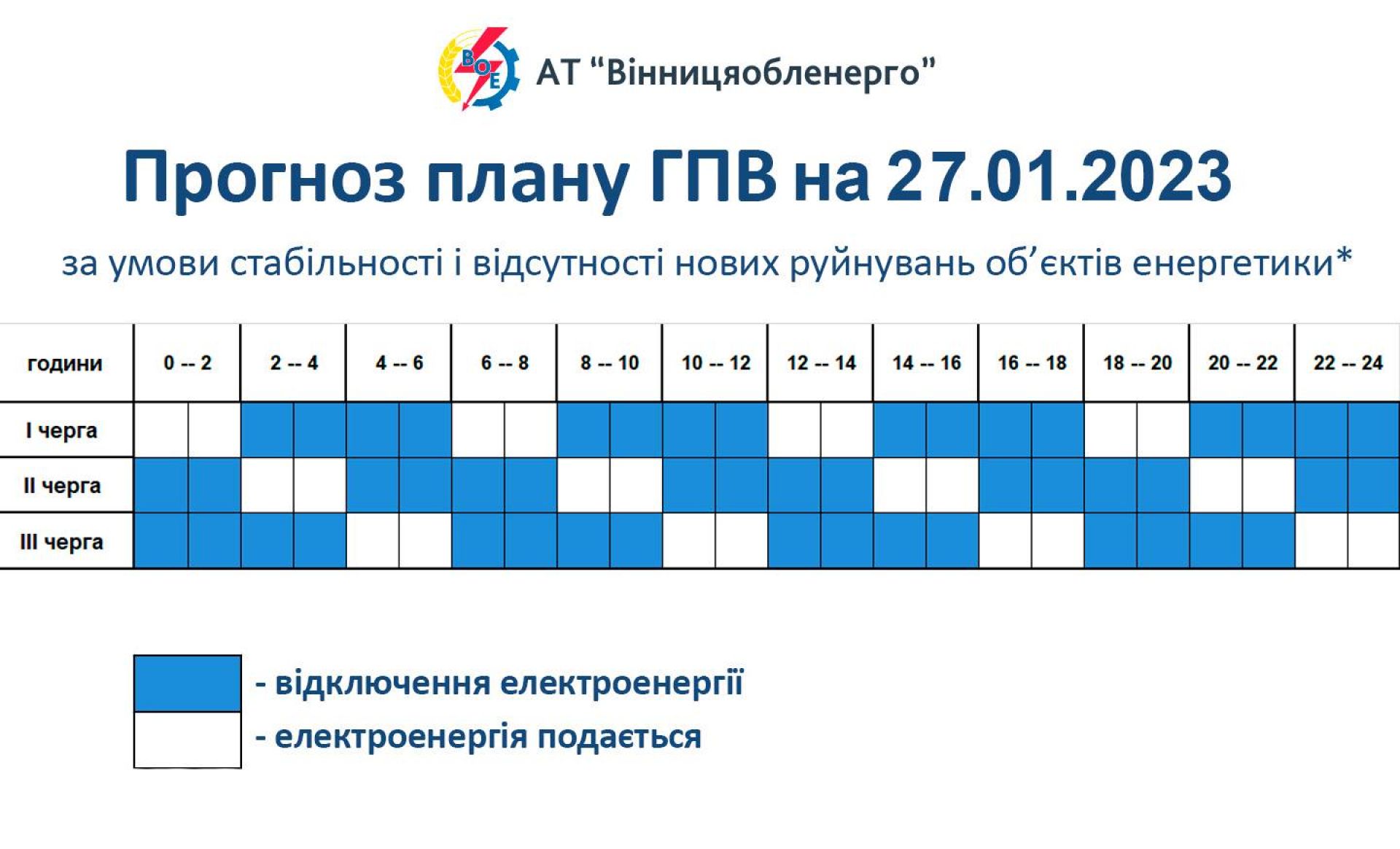 Протягом доби діятиме наступний графік знеструмлень: