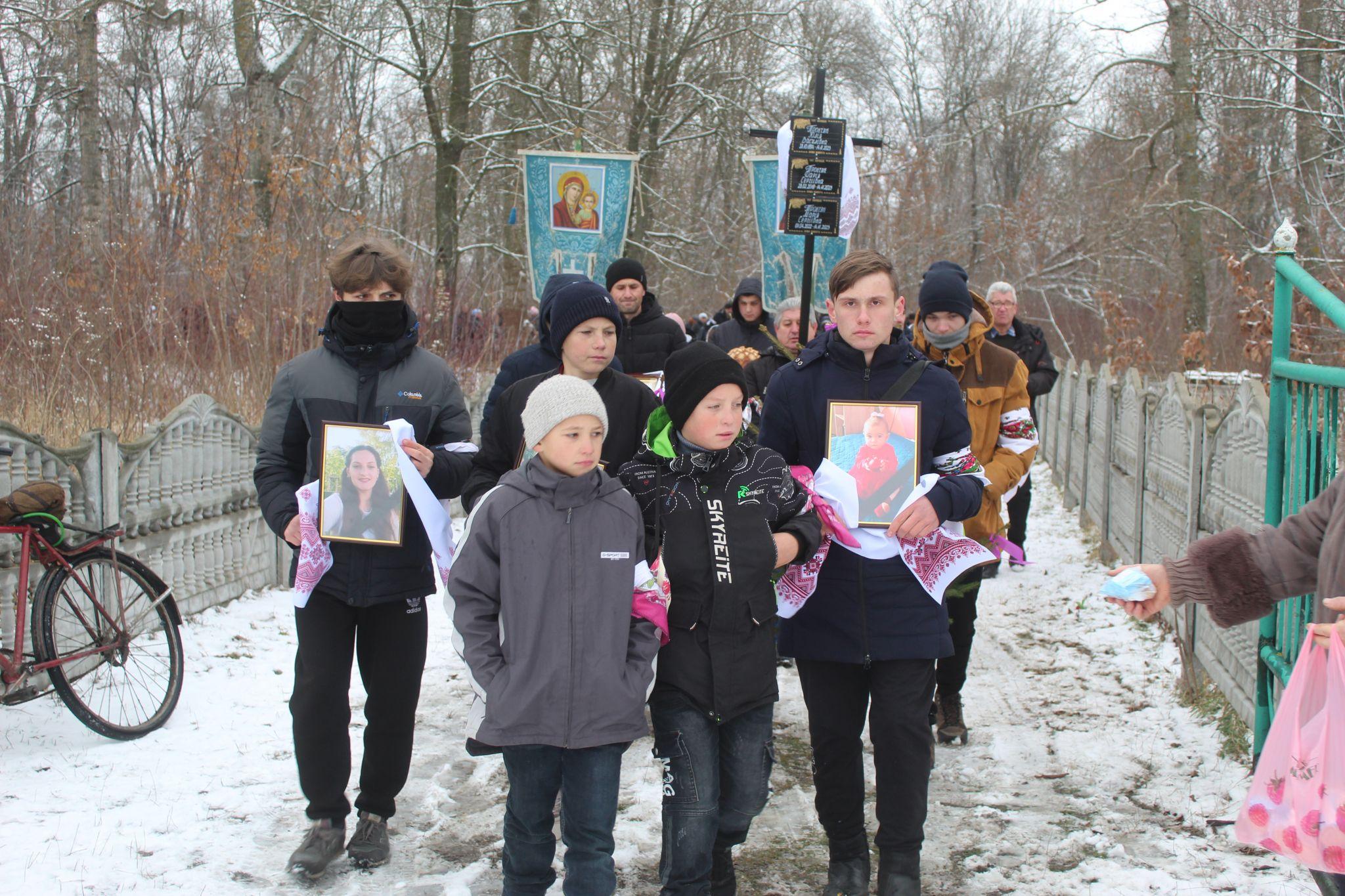 Близько 13 години стала формуватися траурна колона. В її голові двоє хлопчиків, які стелили дорогу прикрасами із різнокольорової фольги. Далі — портрети Юлі, Маші і Даші. За ними — короваї, корзини квітів, дитячі іграшки, дві маленьких ялинки, вбрані в кольорові стрічки.