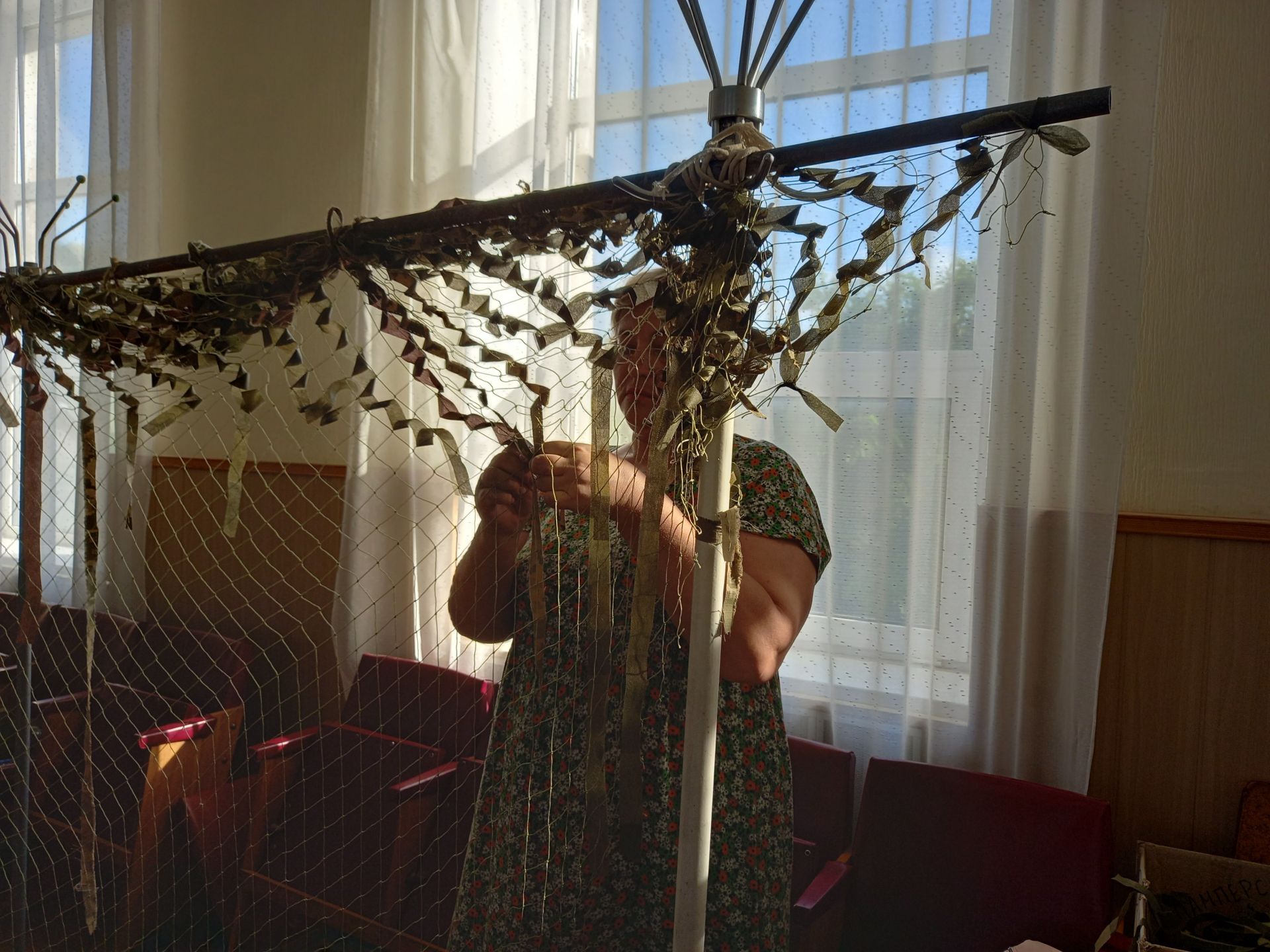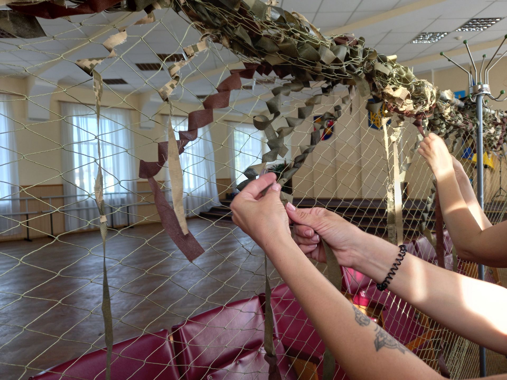 Половина сітки вже готова. Тож дівчатам залишається лише довести справу до кінця. Вони беруть смужки камуфляжної тканини, які для них заздалегідь заготувала команда Тетяни Яковлєвої і беруться до роботи. Стають біля сітки, закріпленої на вішаки, і починають потроху вплітати тканину в основу.