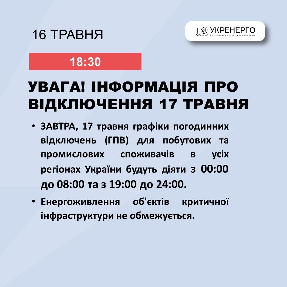 Завтра, 17 травня по всій Україні будуть діяти графіки погодинних відключень — «Укренерго»