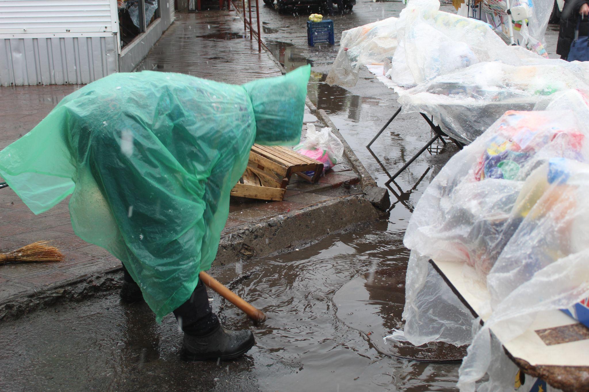 Останнє фото ми зробили на ринку вулиці Василя Земляка.Там забилася каналізація і не байдужі люди пробували пробити її за допомогою шухлевої лопати.