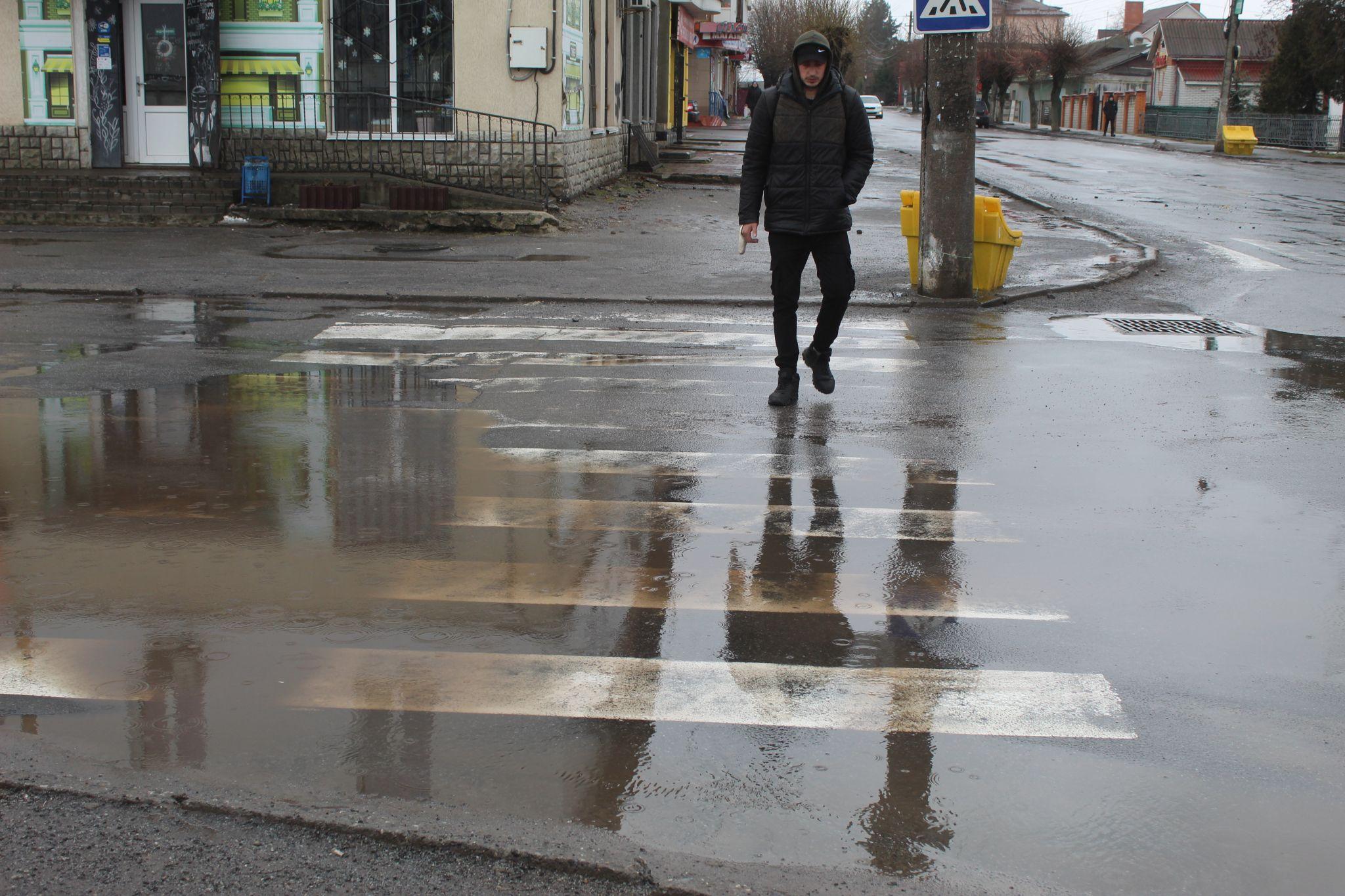 На перехресті вулиць Пилипа Орлика та Незалежності чоловік переходив «зебру» по воді. Такий перехід у нашому місті не один. В морозну погоду на перехрестях ми ковзаємося, а у відлигу чи після дощу на таких переходах жителі міста перевіряють якість свого взуття.