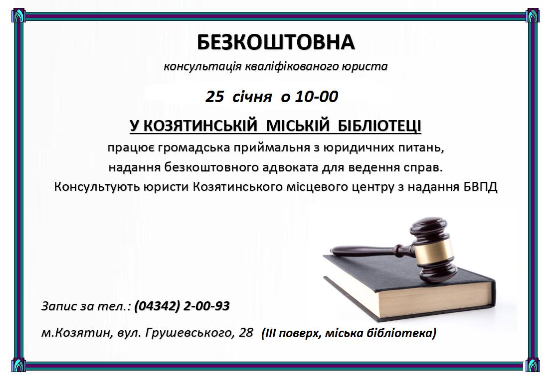 - Сьогодні, 25 січня юристки Козятинського бюро правової допомоги Аліна Бондарчук та Марина Лавренюк відповідали відвідувачам міської бібліотечної установи аби підвищити правові знання козятинчан у сфері земельного законодавства.