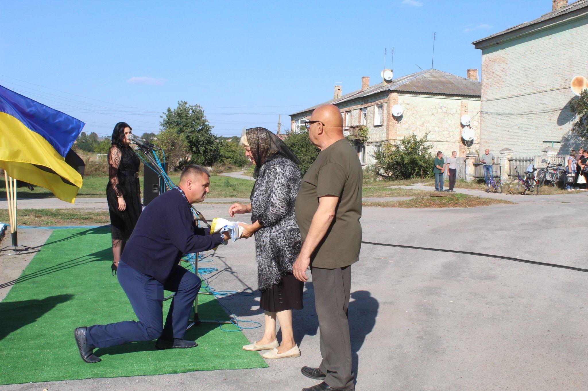 селищному голові, а він прапор від громади вручав родинам загиблих захисників України.