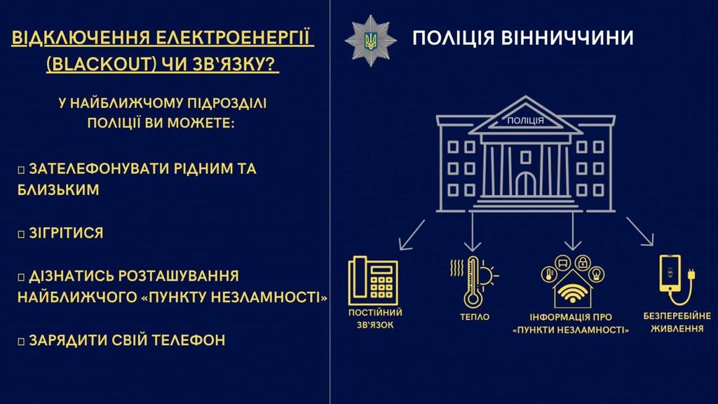 — Ворог намагається знищити енергетичну систему нашої країни. Після чергового масованого ракетного обстрілу території України російською федерацією, більшість квартир та будинків залишається без води та електроенергії, — зазначає поліція Вінницької області. — У разі відсутності мобільного зв’язку та/або електроенергії і вам потрібна допомога, ви можете звернутися до поліцейського офіцера громади, станція якого розташована найближче до вас».