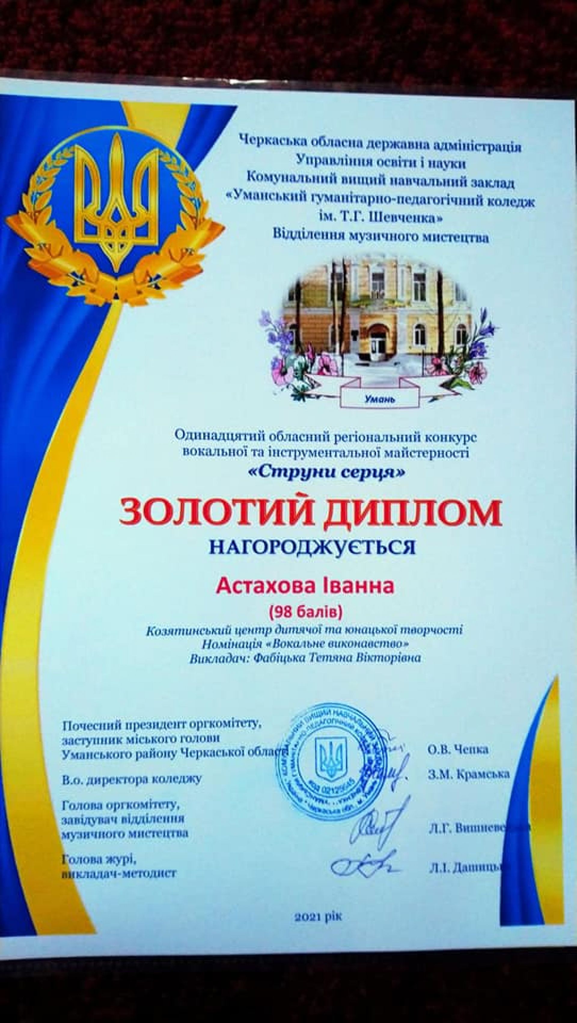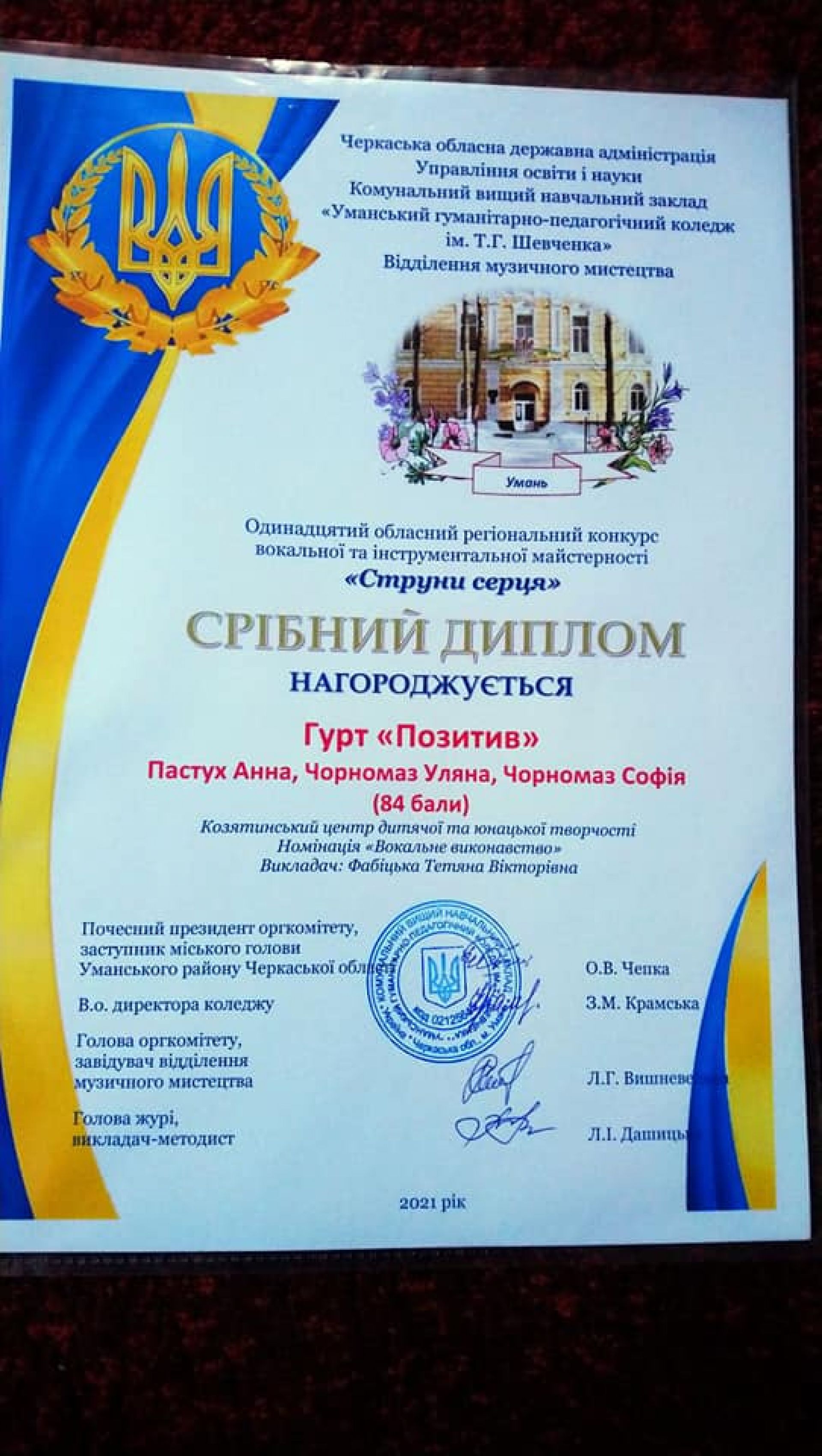 Так, золотий диплом у номінації «Вокальне мистецтво» здобула Іванна Астахова. Срібний диплом за - гуртом «Позитив» (Анна Пастух, Уляна Чорномаз, Софія Чорномаз).