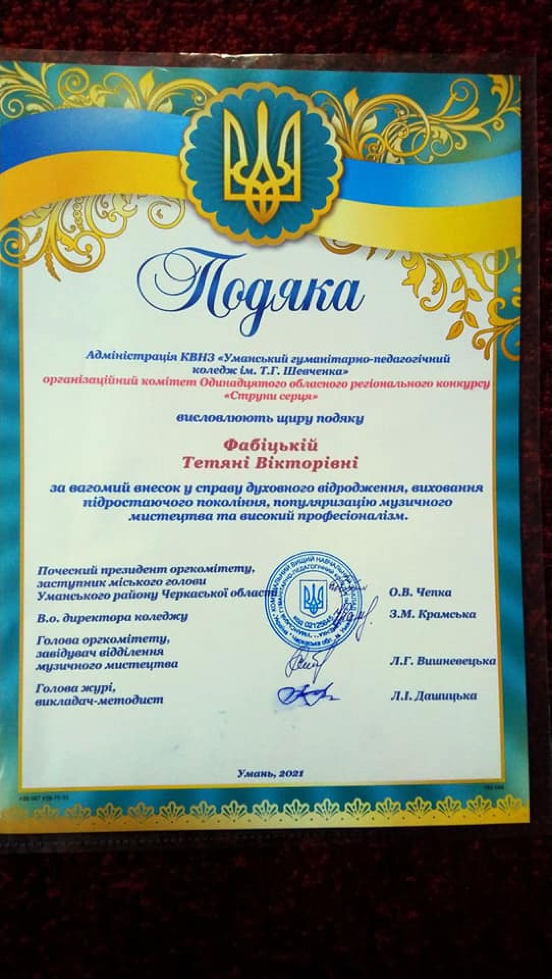 Також адміністрація Уманського гуманітарно-педагогічного коледжу ім. Т.Г. Шевченка та організаційний комітет конкурсу «Струни серця» вручили подяку Тетяні Фабіцькій. За вагомий внесок у справу духовного відродження, виховання підростаючого покоління, популяризацію музичного мистецтва та за високий професіоналізм.