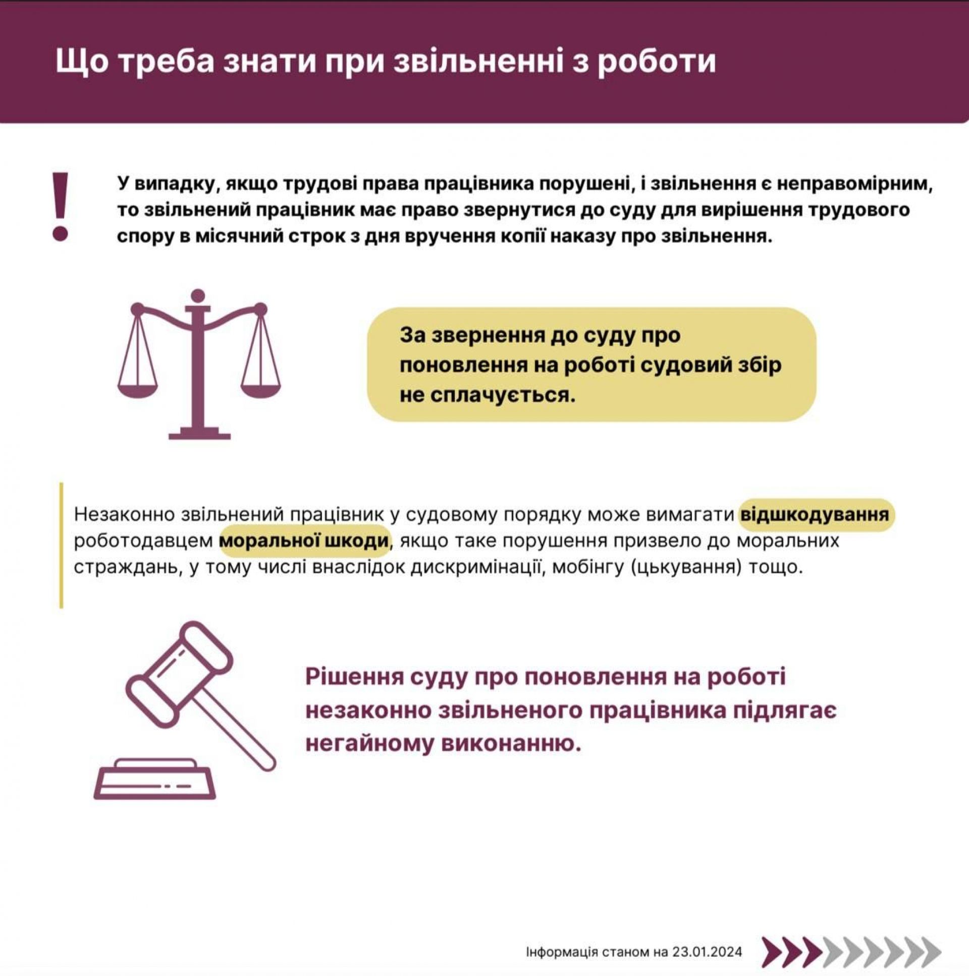 У будь-якій ситуації виникають питання щодо процесу звільнення: який документ підписати, що перевірити у трудовій книжці, коли чекати на розрахункові гроші. А трапляються ситуації, коли треба звертатись до суду за захистом своїх трудових прав.