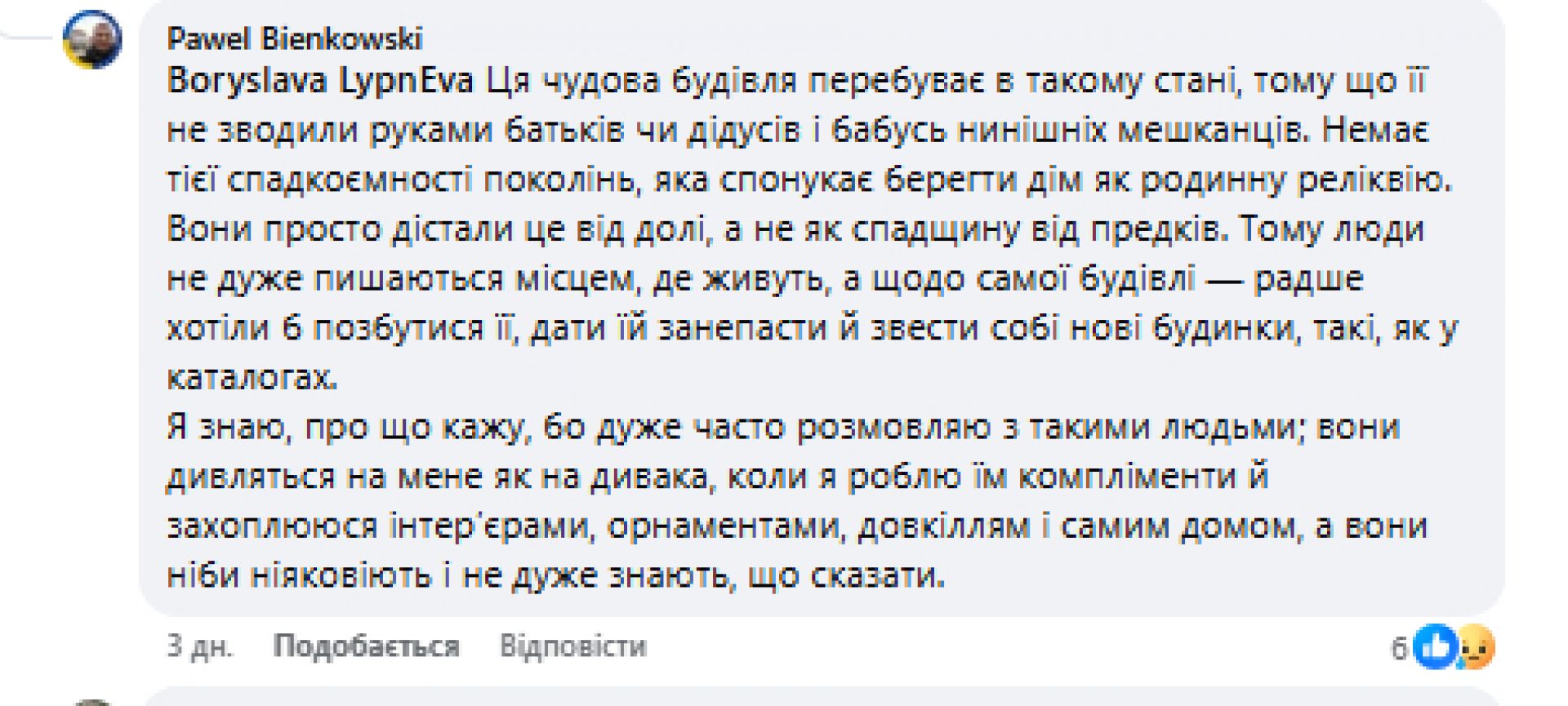 «Ця чудова будівля перебуває в такому стані, тому що її не зводили руками батьків чи дідусів і бабусь нинішніх мешканців. Немає тієї спадкоємності поколінь, яка спонукає берегти дім як родинну реліквію. Вони просто дістали це від долі, а не як спадщину від предків. Тому люди не дуже пишаються місцем, де живуть, а щодо самої будівлі — радше хотіли б позбутися її, дати їй занепасти й звести собі нові будинки, такі, як у каталогах. Я знаю, про що кажу, бо дуже часто розмовляю з такими людьми; вони дивляться на мене як на дивака, коли я роблю їм компліменти й захоплююся інтер’єрами, орнаментами, довкіллям і самим домом, а вони ніби ніяковіють і не дуже знають, що сказати»