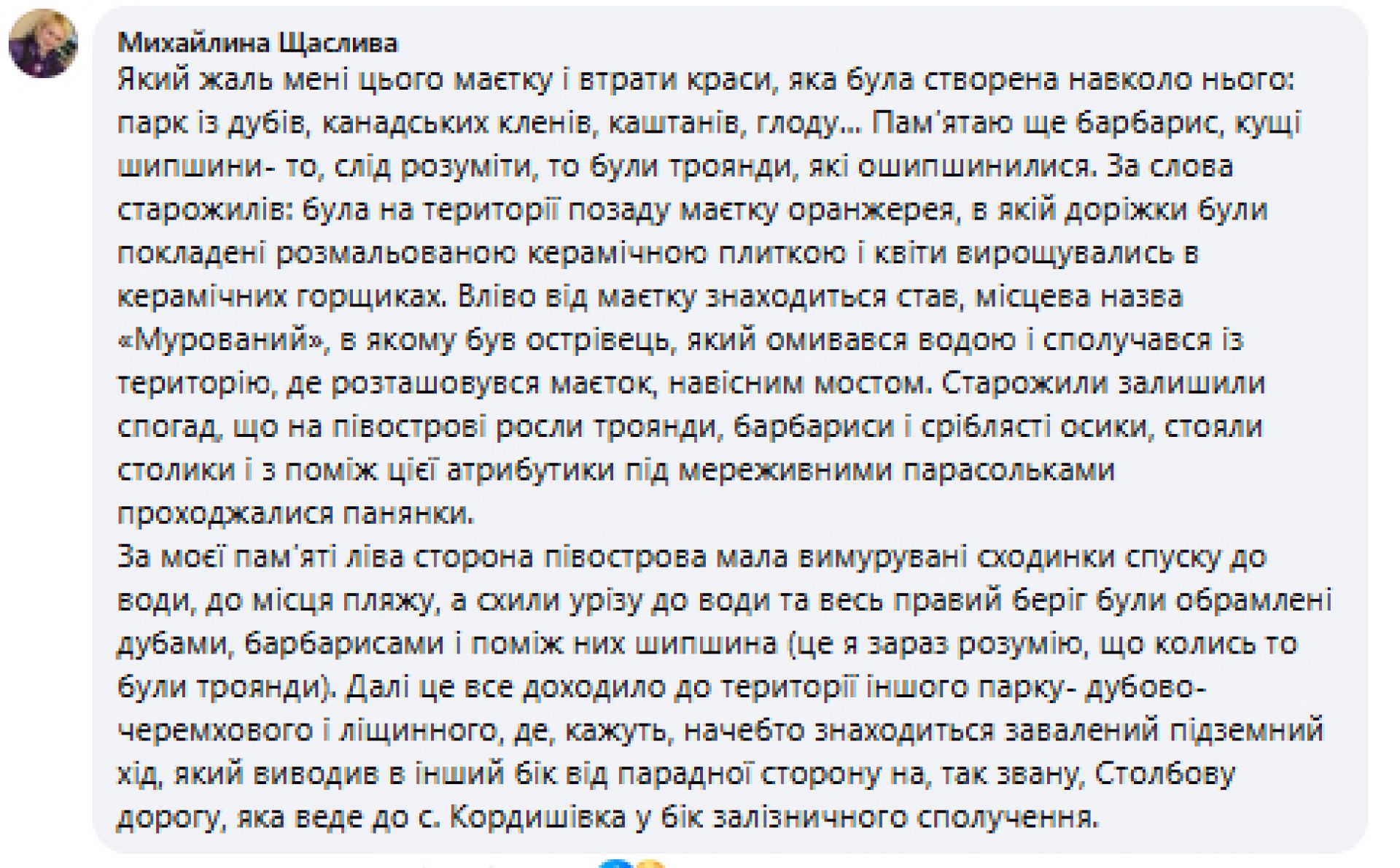 «Який жаль мені цього маєтку і втрати краси, яка була створена навколо нього: парк із дубів, канадських кленів, каштанів, глоду… Памʼятаю ще барбарис, кущі шипшини- то, слід розуміти, то були троянди, які ошипшинилися. За слова старожилів: була на території позаду маєтку оранжерея, в якій доріжки були покладені розмальованою керамічною плиткою і квіти вирощувались в керамічних горщиках. Вліво від маєтку знаходиться став, місцева назва «Мурований», в якому був острівець, який омивався водою і сполучався із територію, де розташовувся маєток, навісним мостом. Старожили залишили спогад, що на півострові росли троянди, барбариси і сріблясті осики, стояли столики і з поміж цієї атрибутики під мереживними парасольками проходжалися панянки. За моєї памʼяті ліва сторона півострова мала вимурувані сходинки спуску до води, до місця пляжу, а схили урізу до води та весь правий беріг були обрамлені дубами, барбарисами і поміж них шипшина (це я зараз розумію, що колись то були троянди). Далі це все доходило до території іншого парку- дубово-черемхового і ліщинного, де, кажуть, начебто знаходиться завалений підземний хід, який виводив в інший бік від парадної сторону на, так звану, Столбову дорогу, яка веде до с. Кордишівка у бік залізничного сполучення»