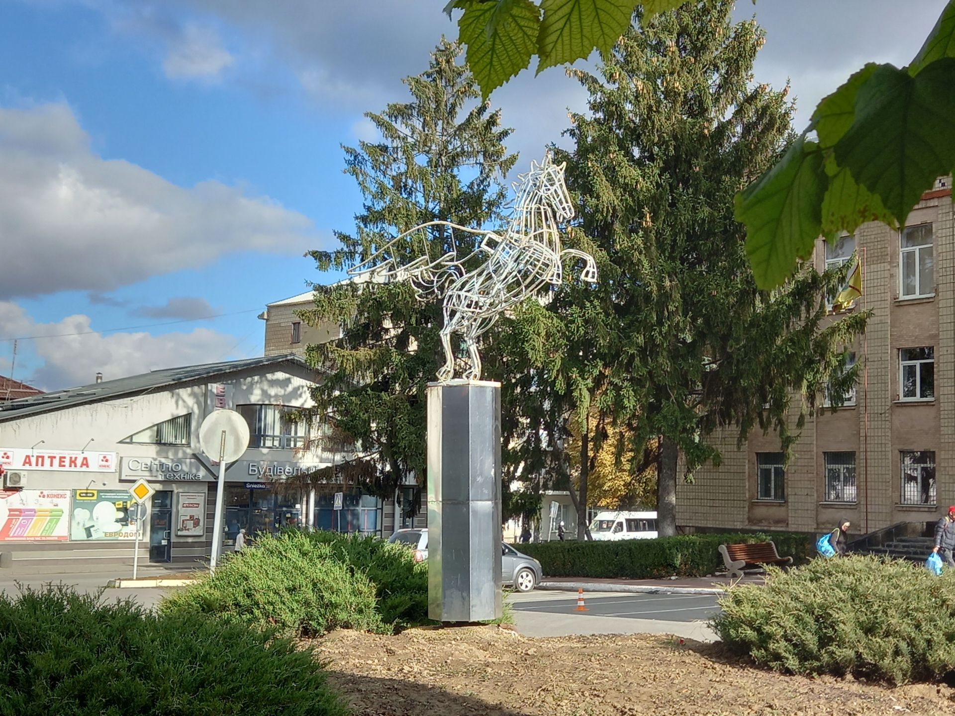 У середмісті Жмеринки нам трапилася ще одна цікава скульптура, теж металева. На краю великої клумби височіє міфічний персонаж — Пегас.