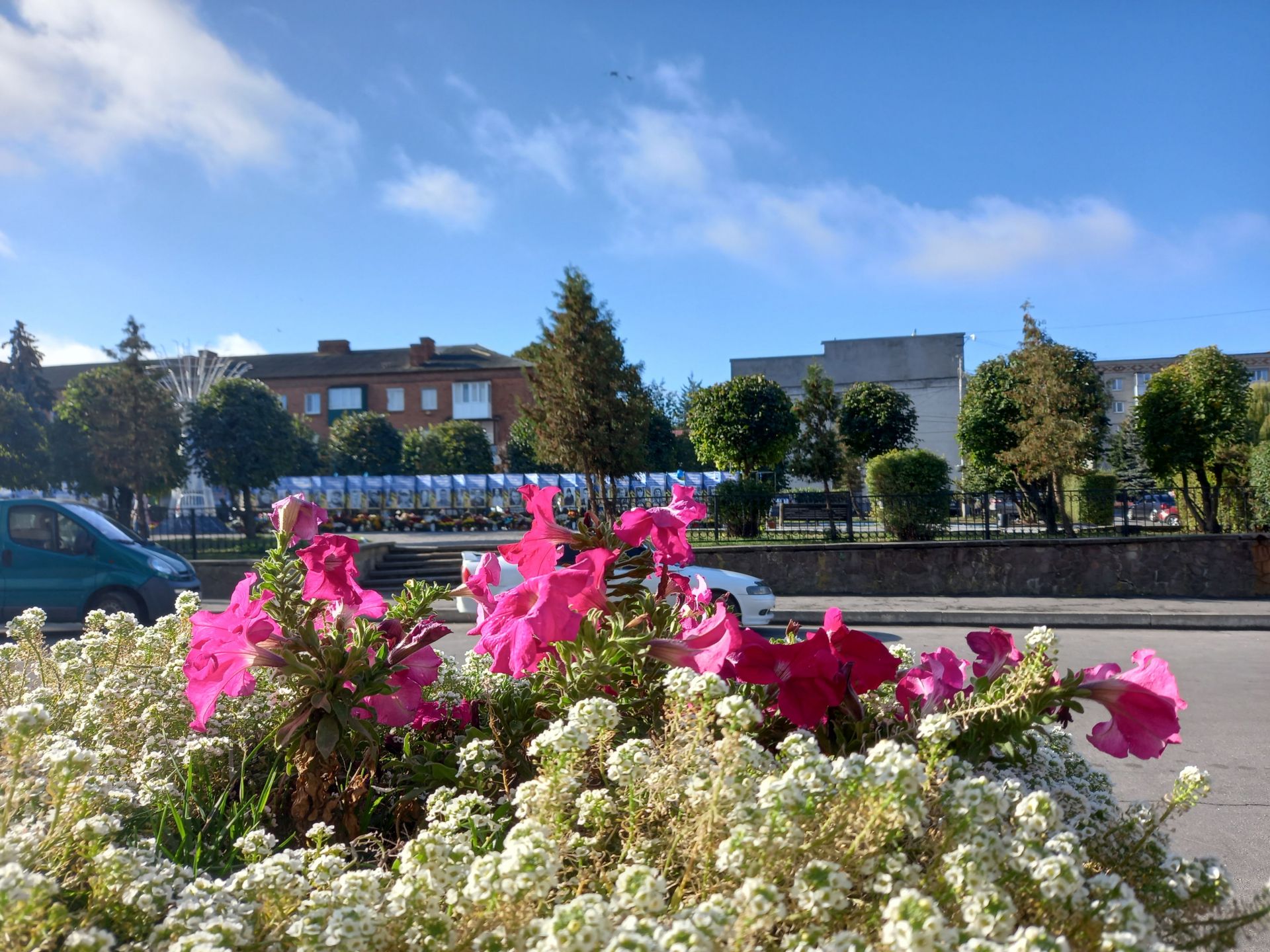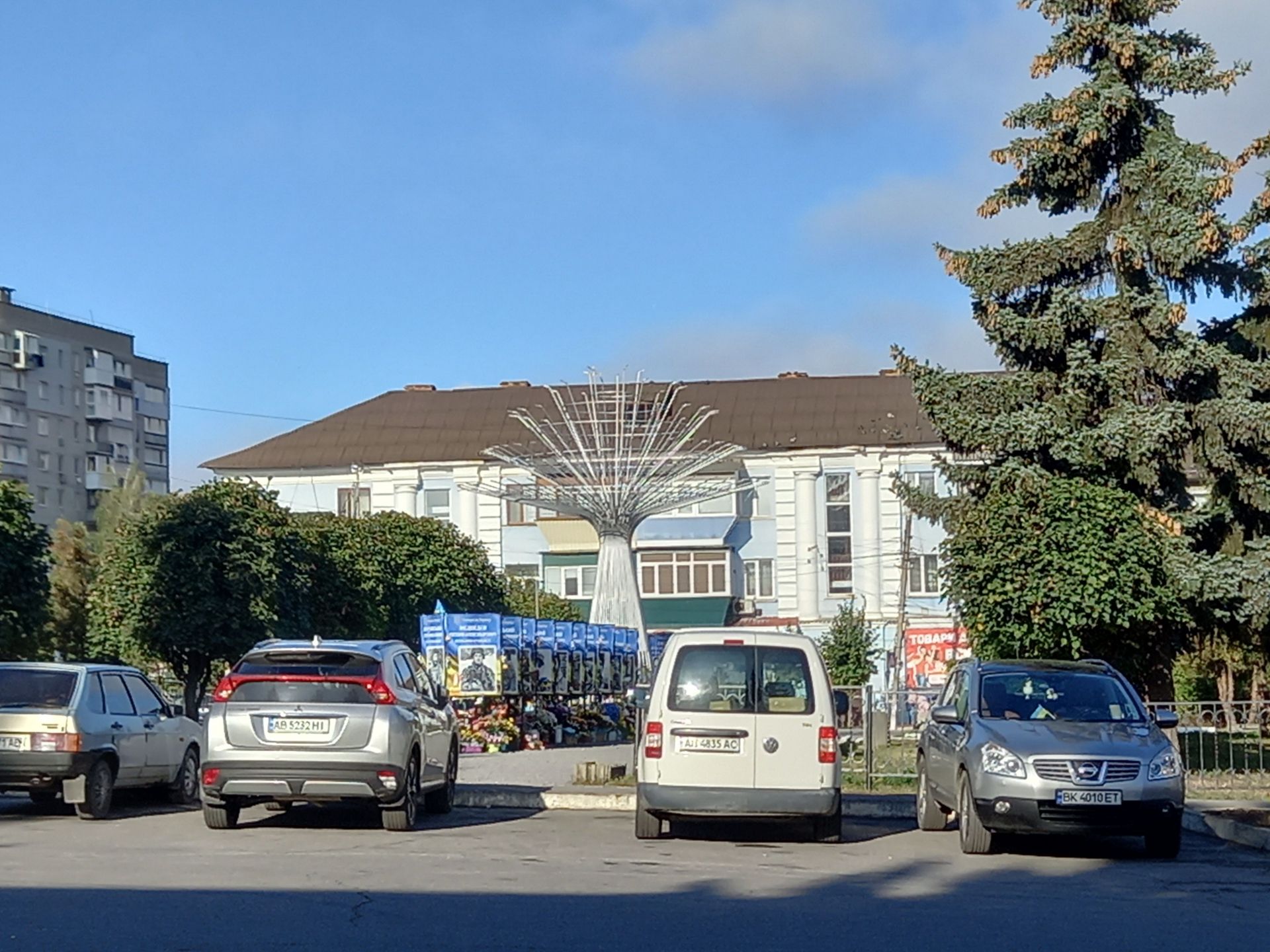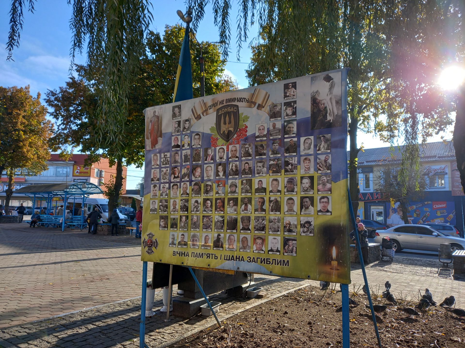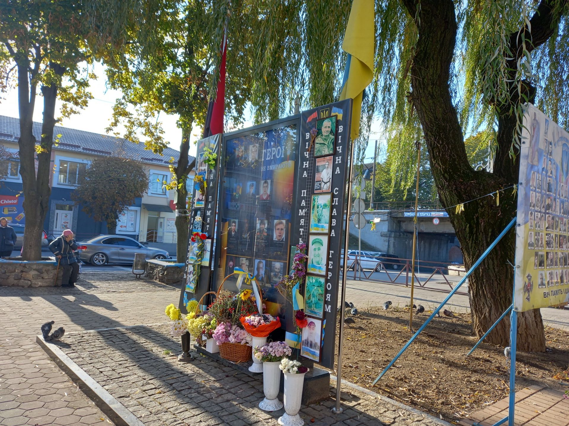 Що ще привернуло нашу увагу, так це підхід до вшанування Героїв, які загинули на війні. За кілька кроків від вокзалу, у невеликому сквері стенд із фотографіями військових, що віддали своє життя за Україну. Поруч — ще одна дошка зі світлинами загиблих Героїв. По обидва боки прапори: жовто-блакитний і червоно-чорний. А перед дошкою у вазах та корзинах стоять живі квіти.