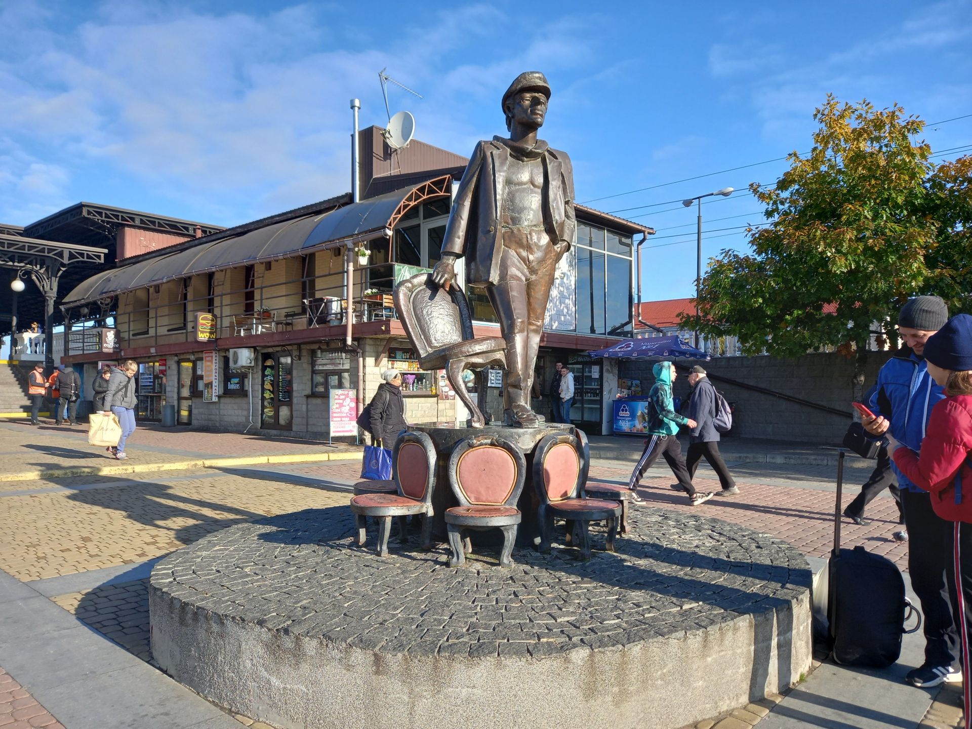 Перед приміщенням вокзалу — привокзальна площа. Якщо у нас там пам’ятники радянської доби (робочий та селянка з яблуками) то у Жмеринці все значно оригінальніше. Там на привокзальній площі бронзовий Остап Бендер, відомий персонаж романів «12 стільців» та «Золоте теля». Жмеринський Остап стоїть саме в оточенні стільців, щоправда, ми нарахували їх не 12, а лише 8 — сім стільців навколо п'єдесталу, на якому стоїть головна фігура, восьмий стілець Остап Бендер тримає у руці.