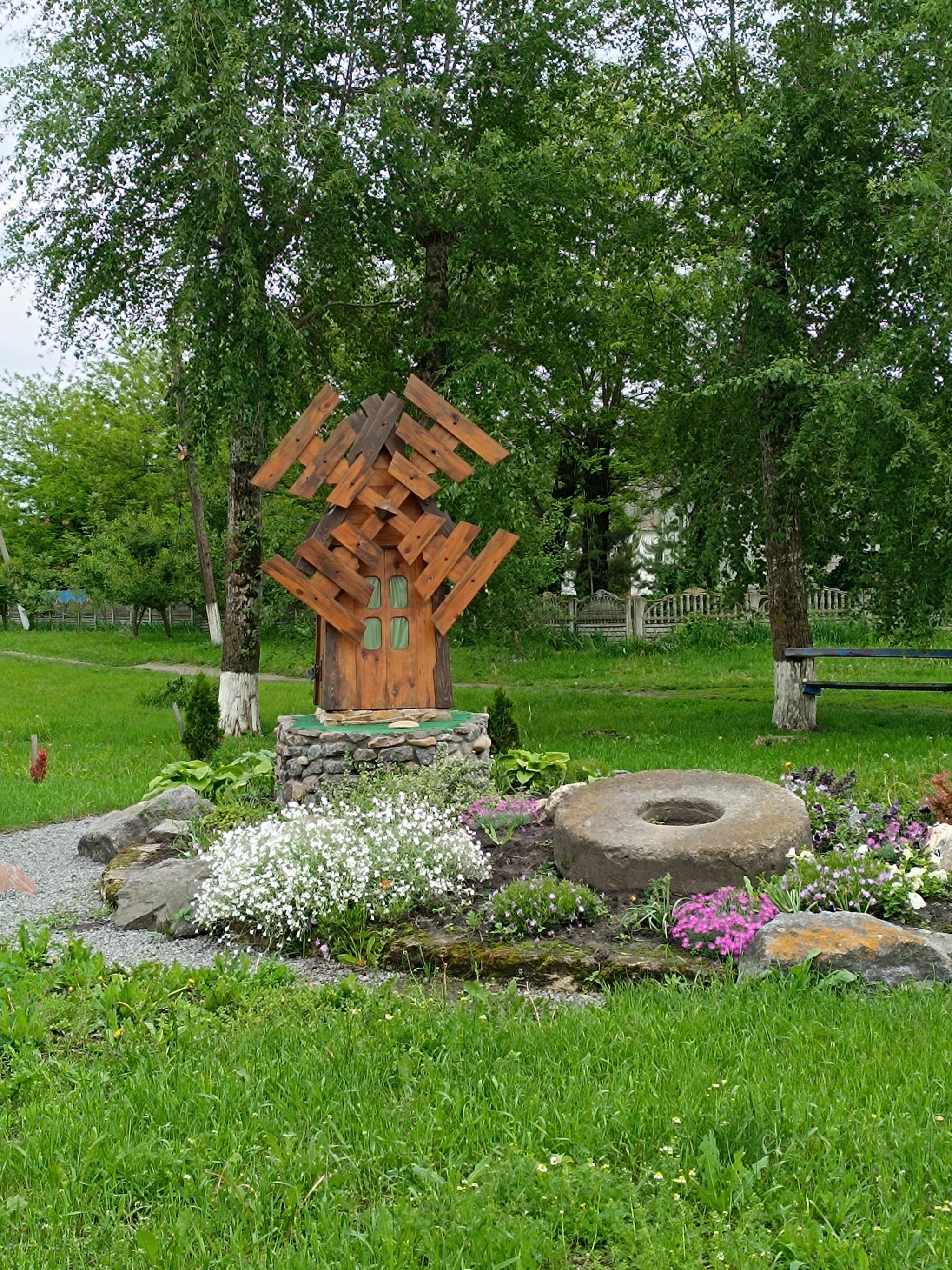 Коли ми чуємо про Білопілля, перше, що одразу спадає на думку — Музей хліба під відкритим небом. Воно й не дивно, адже це унікальний культурний об’єкт Вінницької області, куди приїжджають з різних куточків України. Справжня гордість та родзинка цього музею — старовинний вітряк, якому вже більше ста років. Втім вітряк у Білопіллі не один. Неподалік від сільського цвинтаря ми натрапили на цікавий арт-об’єкт: у квітнику крихітний дерев’яний вітряк, а поруч із ним — жорна.