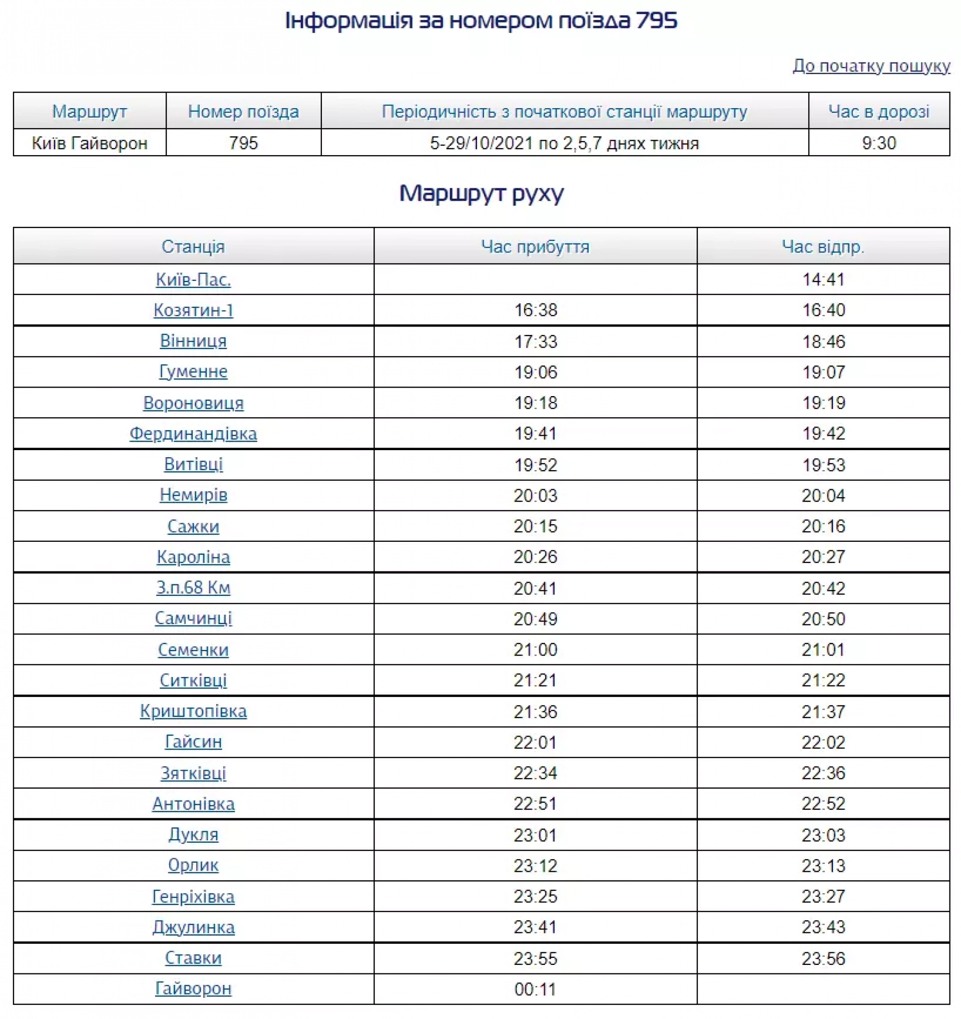 На Вінниччині розпочав курсувати регіональний поїзд № 795/796 Київ – Гайворон (Кіровоградська область). Даний потяг з’єднує кілька областей. Зокрема, у Вінницькій області потяг зупиняється у 15 населених пунктах.