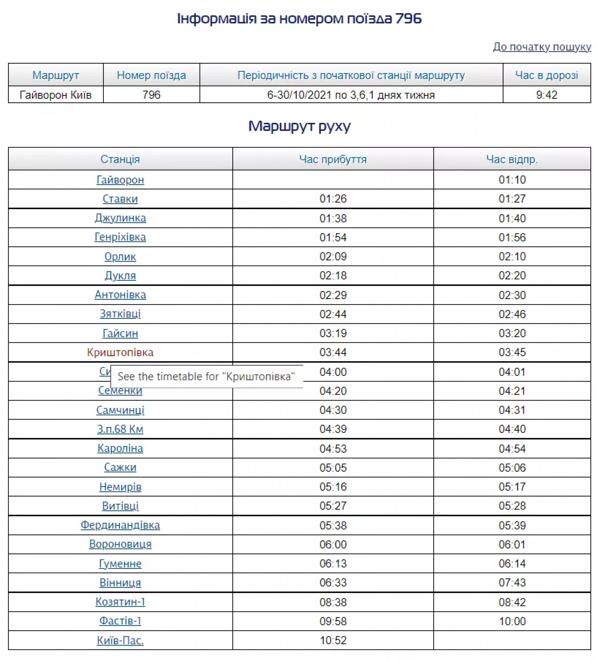 Даний поїзд буде їздити по вівторками, п’ятницях та неділях. З Києва буде вирушати о 14:41. У зворотному напрямку цей поїзд курсуватиме по понеділках, середах і суботах. Відправлятиметься з Гайворона о 01:10 і прибуватиме до Києва о 10:52.